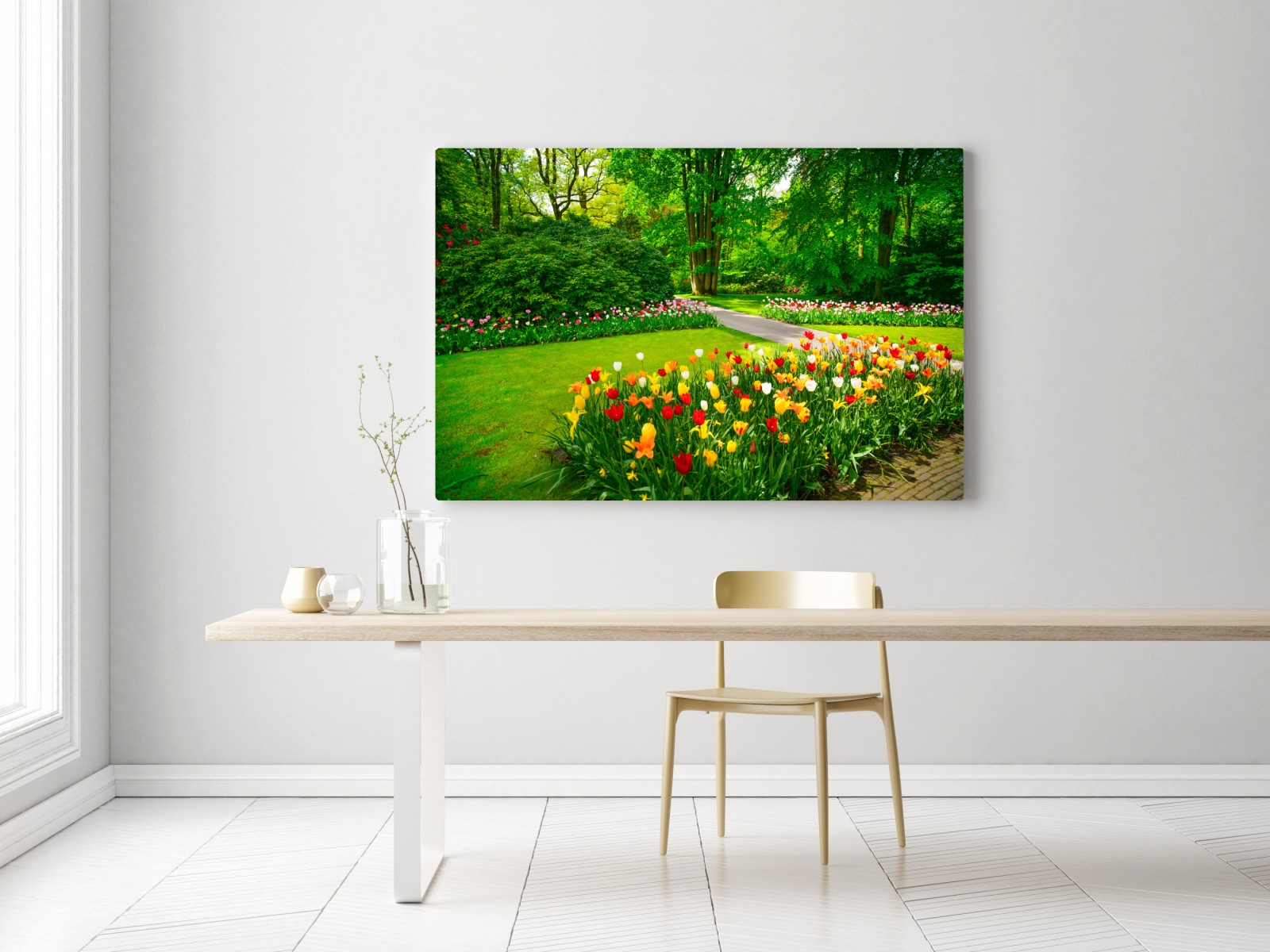 Bringen Sie die lebendigen Farben von Keukenhof in Ihren Raum mit dieser üppigen Tulpengartenszene, ideal, um jedem Raum natürliche Energie und Gelassenheit zu verleihen.MehrWeniger
