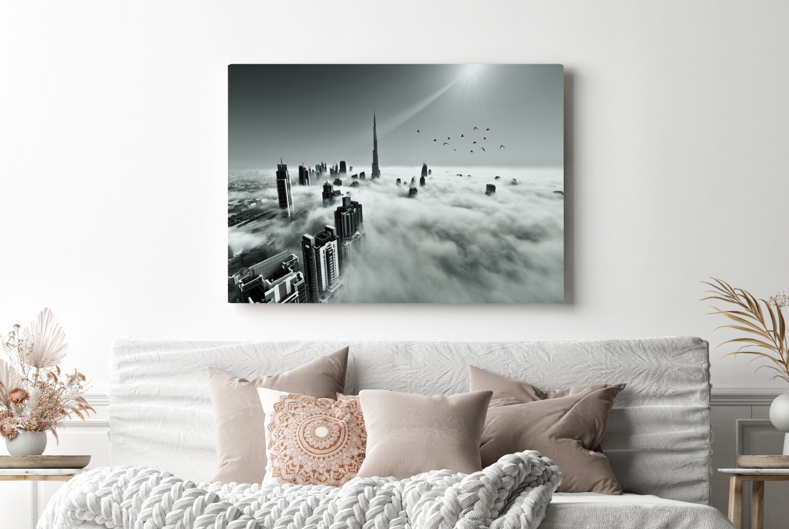 Leinwandbild Neblige skyline von Dubai über den wolken