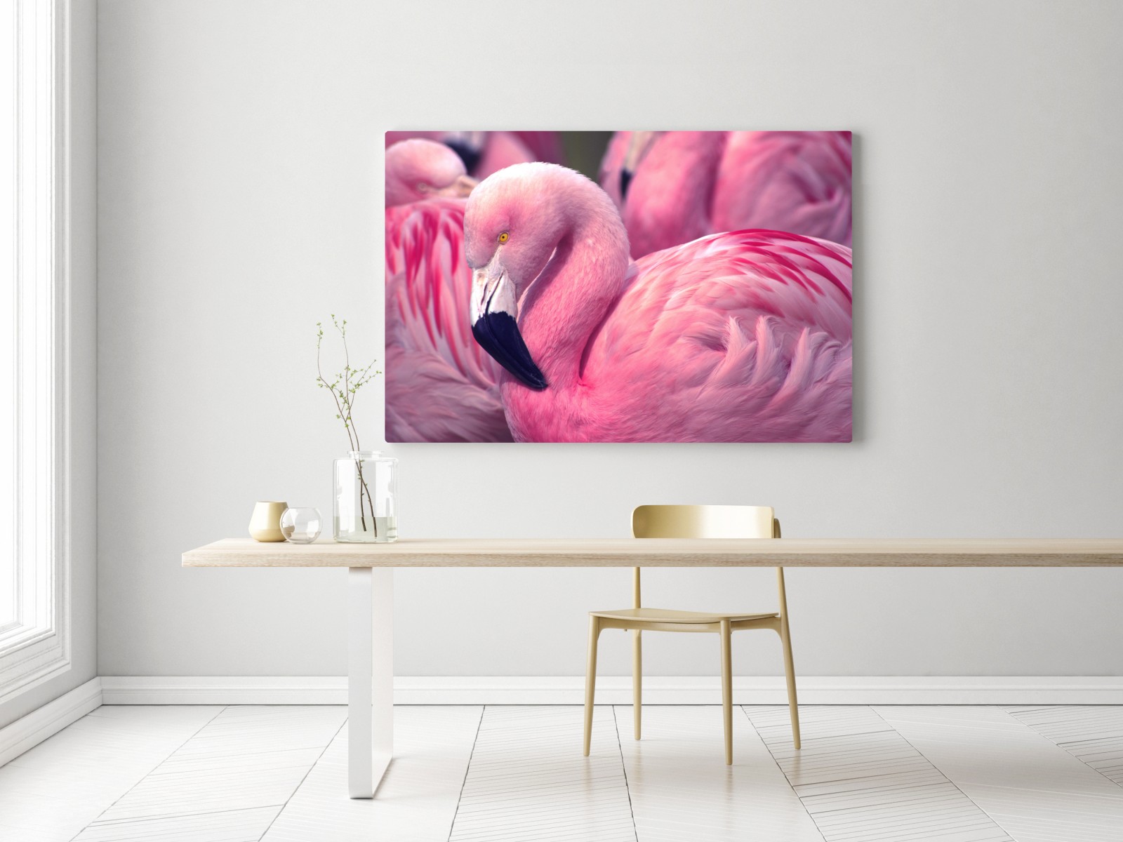 Bringen Sie tropischen Charme in Ihr Zuhause mit diesem lebendigen Nahaufnahmebild eines rosa Flamingos, perfekt als Wanddekoration für jeden Raum.MehrWeniger