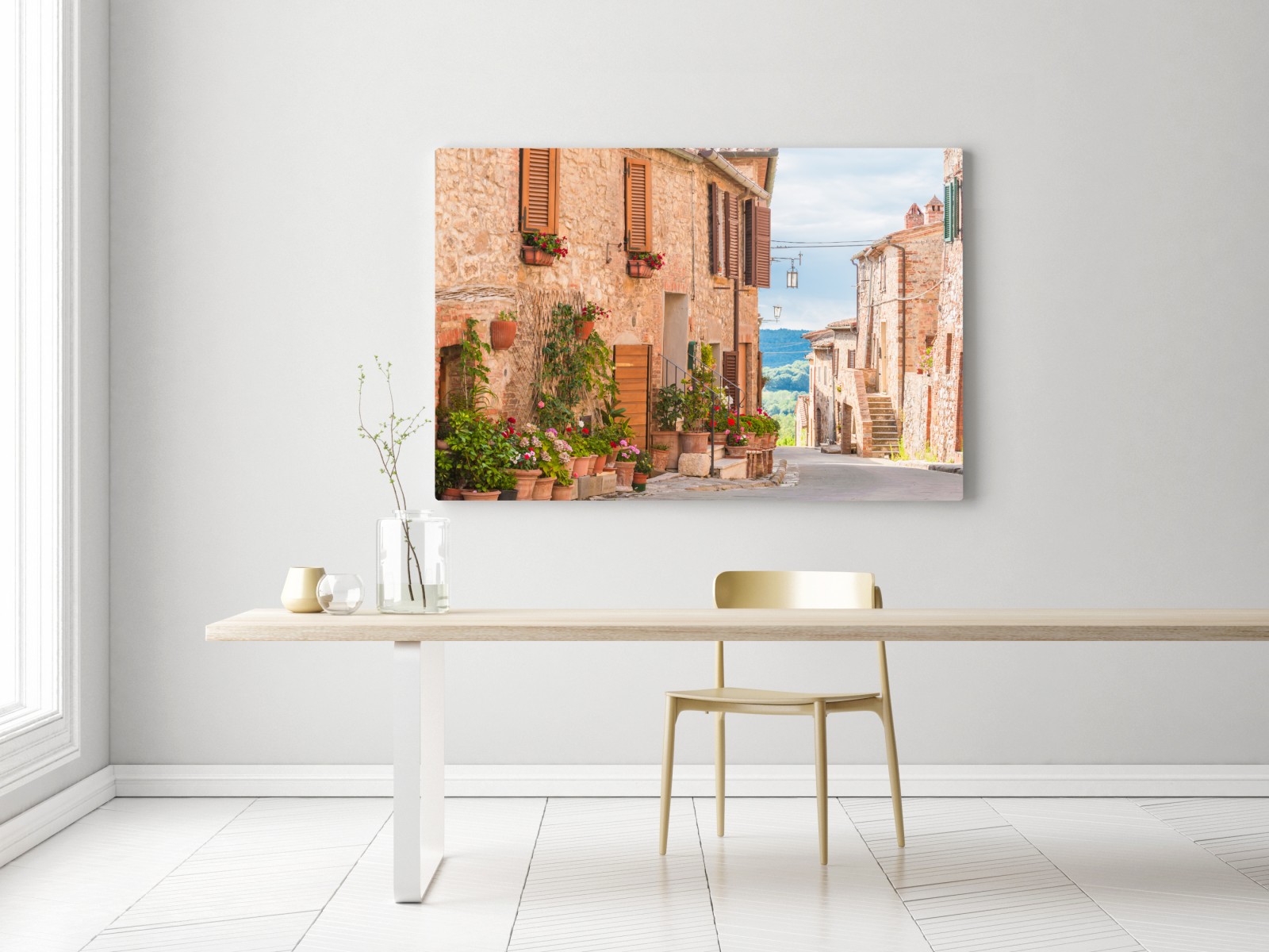 Bringen Sie den Charme eines alten toskanischen Dorfes in Ihr Zuhause mit dieser sonnenbeschienenen Straße, gesäumt von Steinhäusern und blühenden Blumentöpfen.MehrWeniger