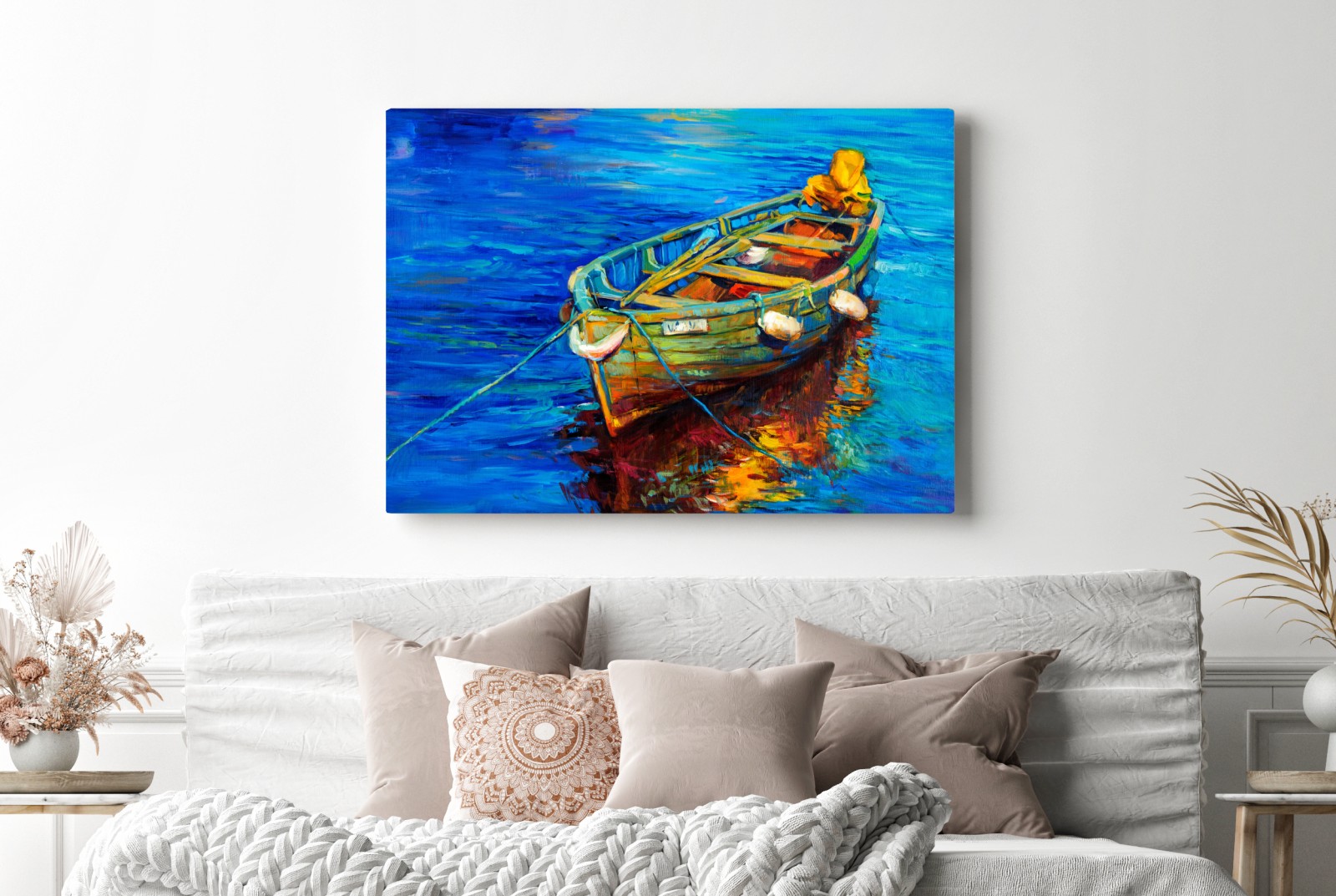 Leinwandbild Lebendiges boot bei sonnenuntergang