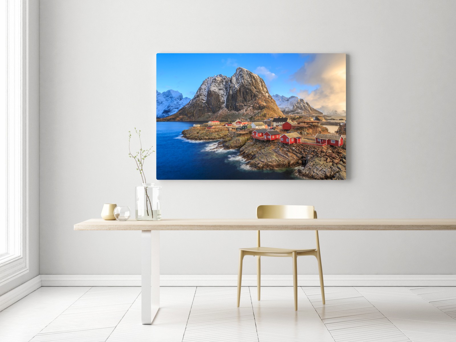 Leinwandbild Küstendorf in Norwegen mit roten fischerhütten