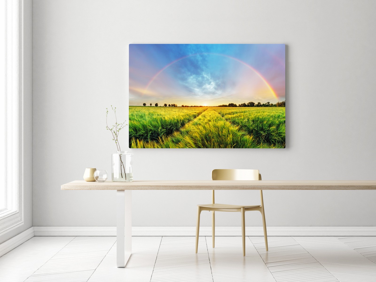 Leinwandbild Regenbogen über goldenem weizenfeld bei sonnenuntergang