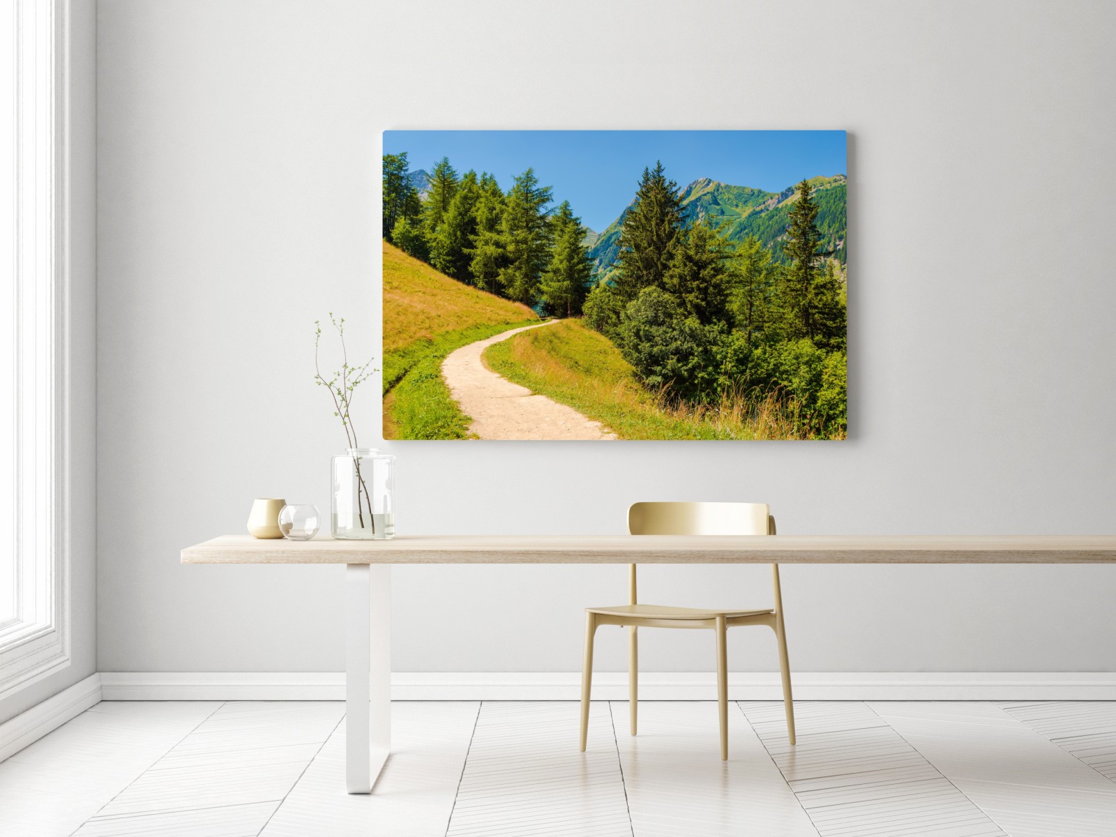 Bringen Sie die ruhige Schönheit der Schweizer Alpen in Ihr Zuhause mit dieser lebendigen Sommeraufnahme eines Bergwegs.MehrWeniger