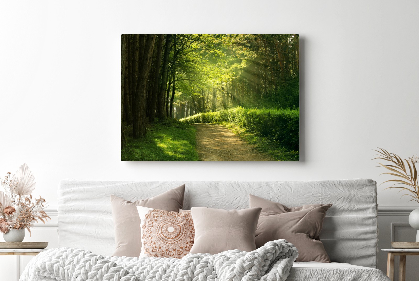 Leinwandbild Sonnenbeschienener waldpfad im grünen
