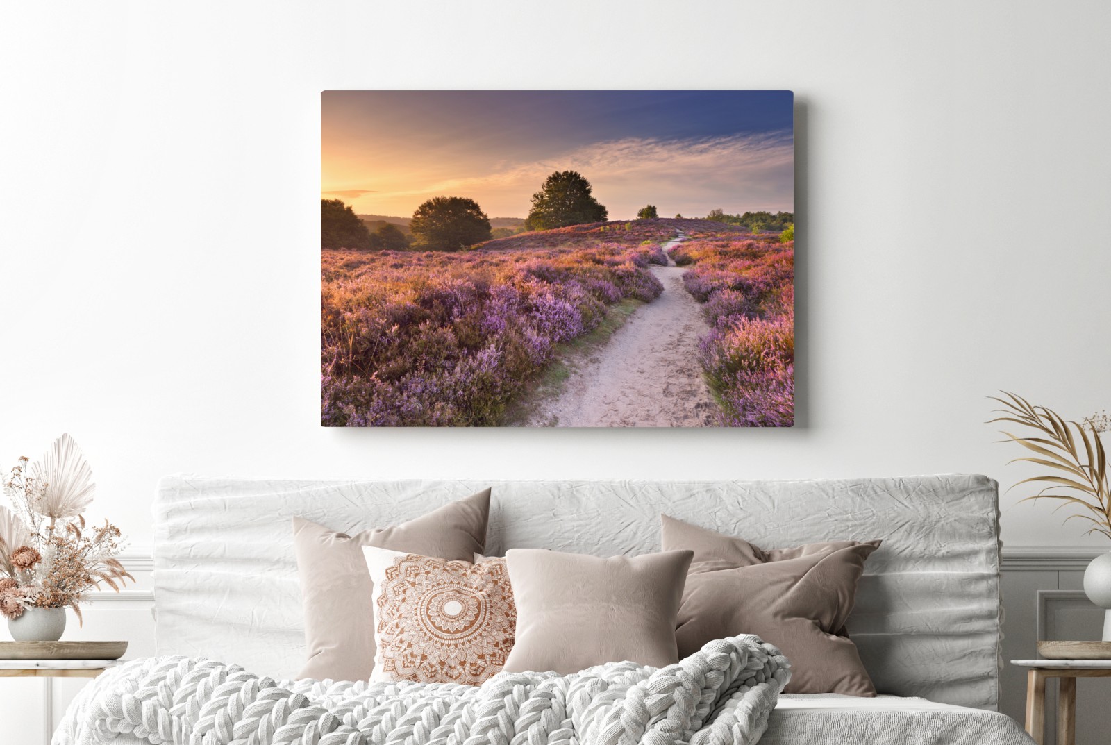 Leinwandbild Posbank bei sonnenaufgang über blühender heide