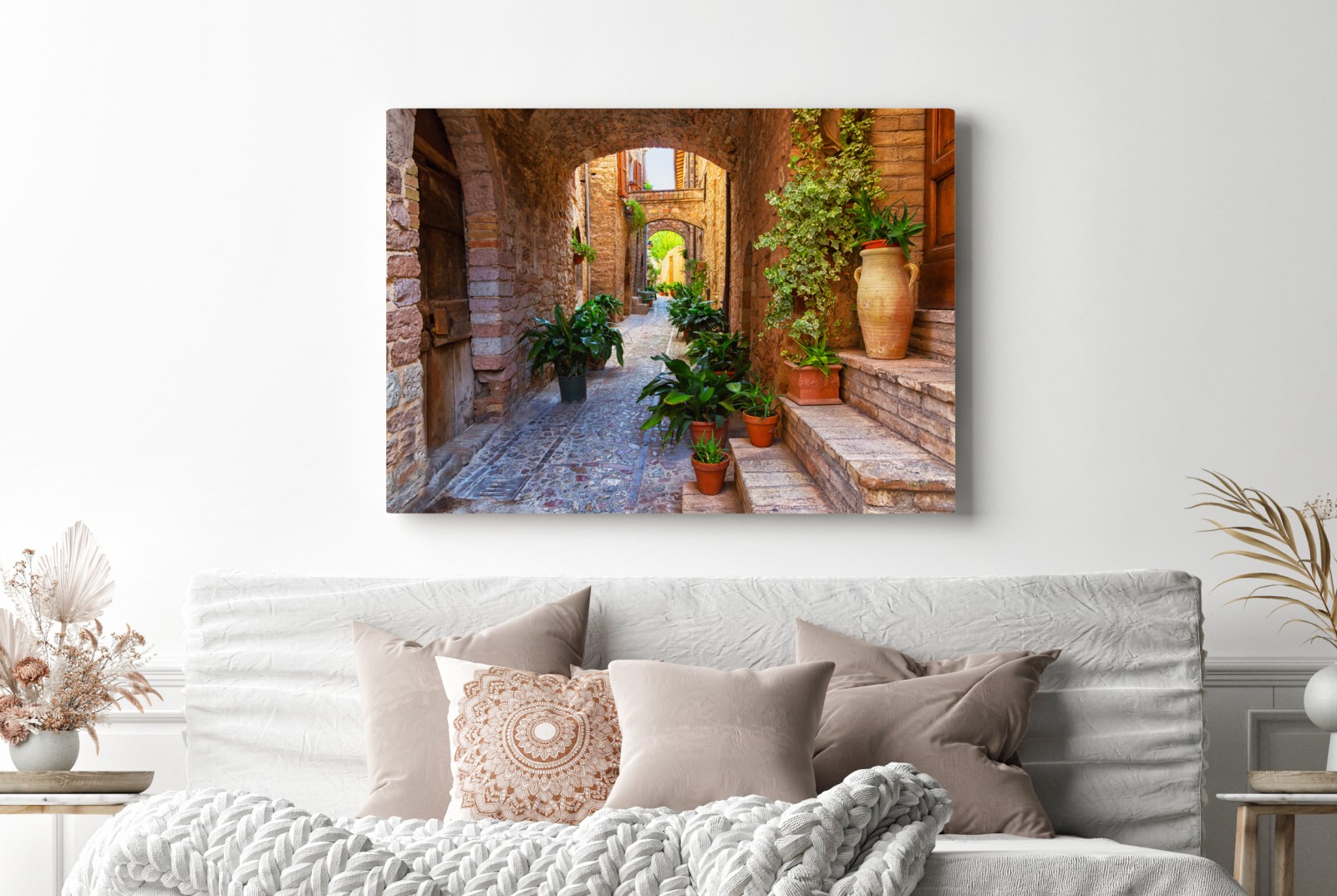 Leinwandbild Sonnige gasse mit blumentöpfen in Spello