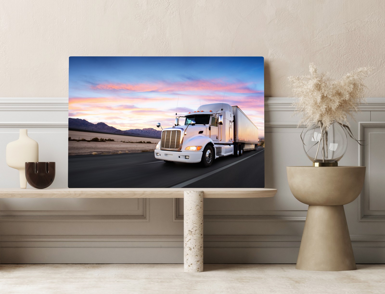 Leinwandbild Lastwagen bei sonnenuntergang auf der autobahn