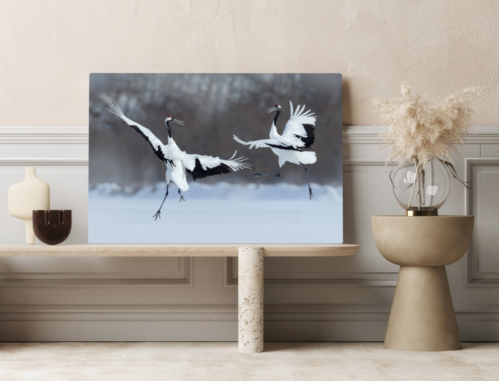 Leinwandbild Tanzende rotkronenkraniche im schnee, Hokkaido
