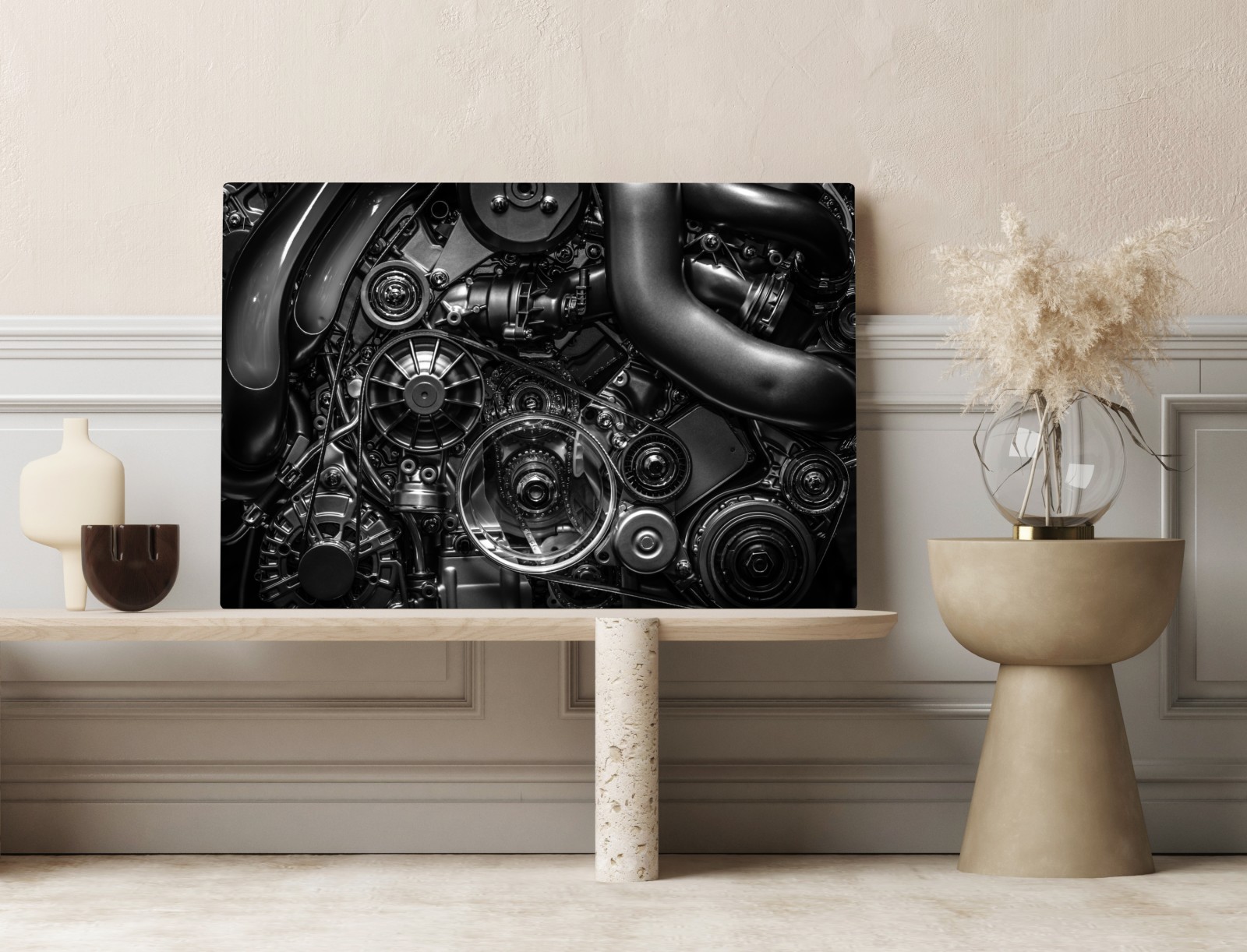 Heben Sie die rohe Schönheit der Präzisionsmechanik mit dieser eindrucksvollen monochromen Motoraufnahme hervor, perfekt für industrielle Innenräume.MehrWeniger