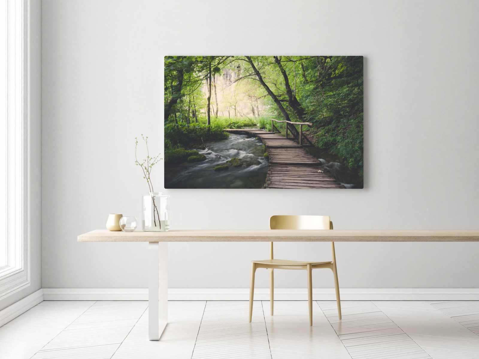 Leinwandbild Ruhiger hölzerner steg durch grünen wald