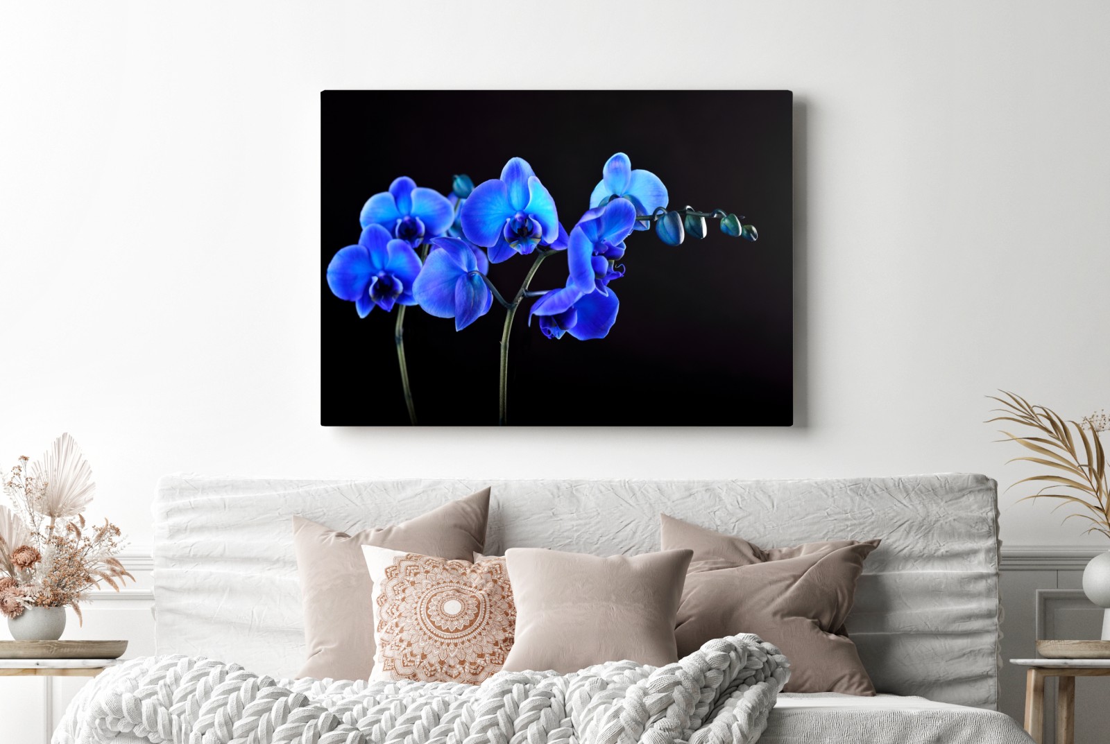 Bringen Sie elegante Ruhe in Ihr Zuhause mit dieser leuchtenden blauen Orchidee vor einem tiefschwarzen Hintergrund.MehrWeniger