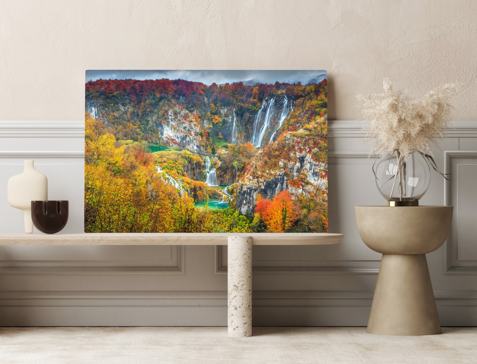 Leinwandbild Herbstliche wasserfälle in einem farbenfrohen wald