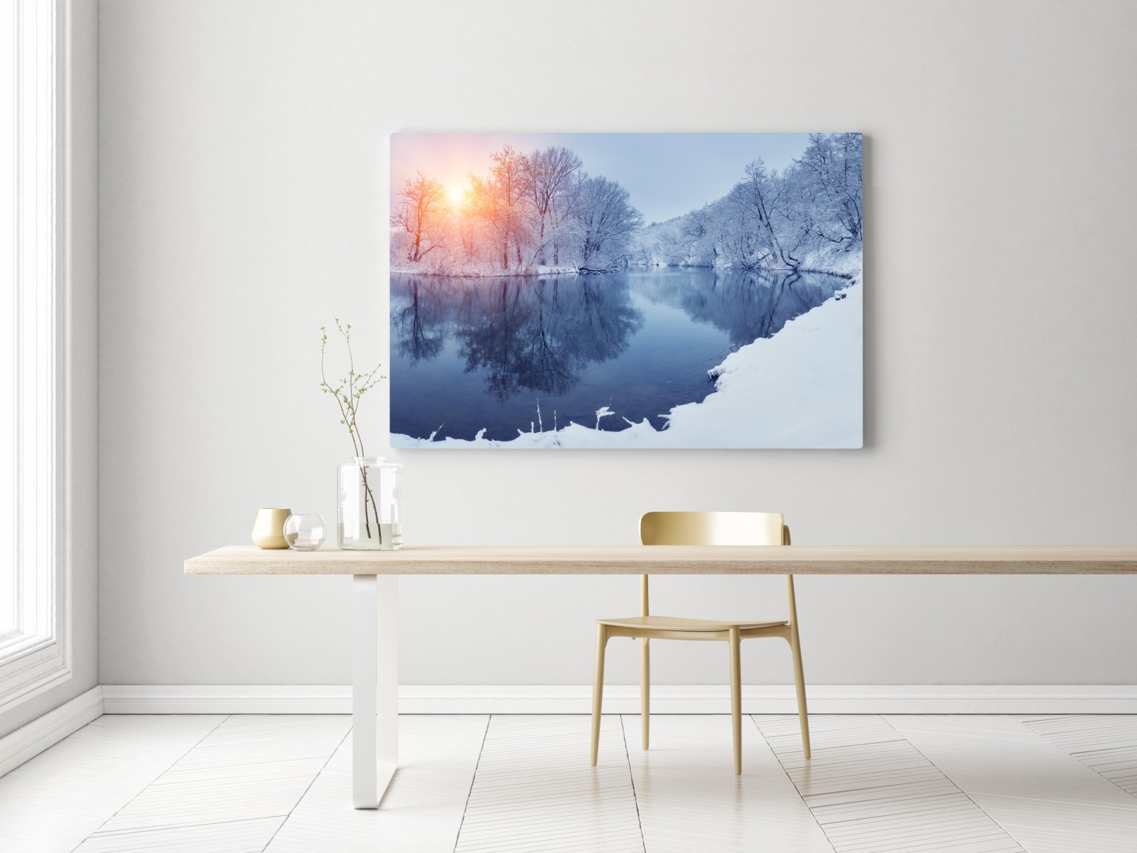 Leinwandbild Winterliche flusslandschaft bei sonnenuntergang