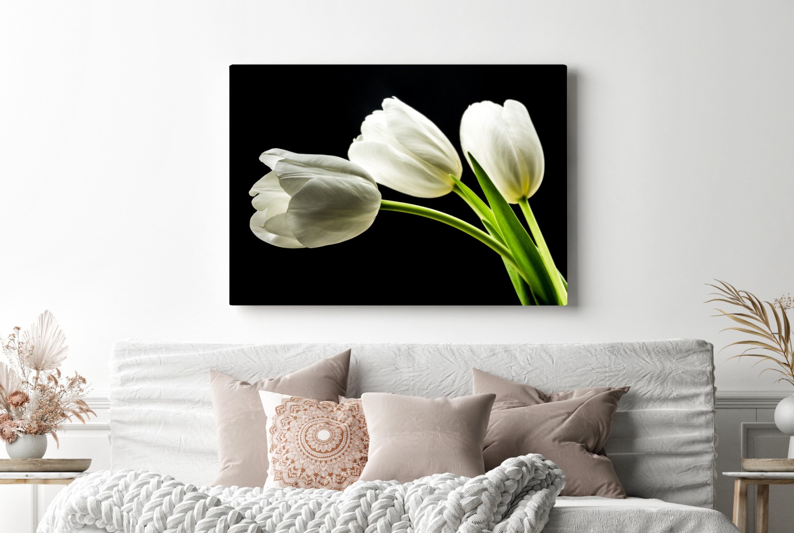 Leinwandbild Elegante weiße tulpen vor schwarzem hintergrund