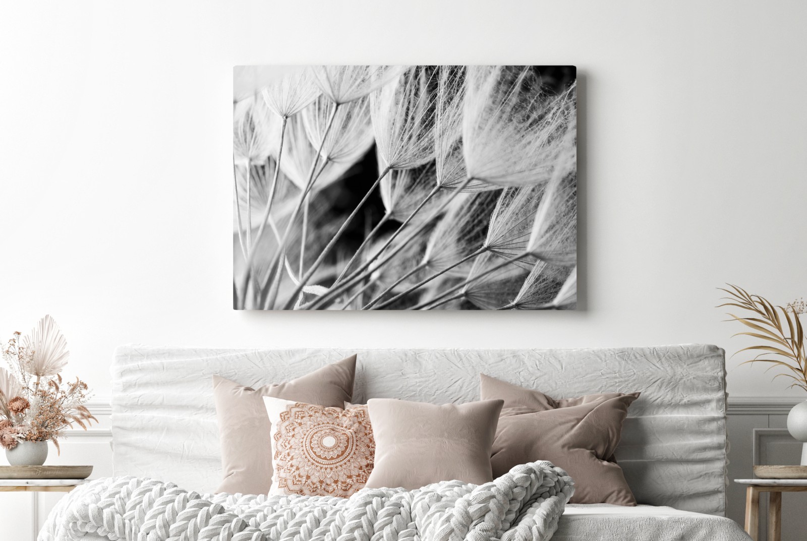 Leinwandbild Zarte nahaufnahme von löwenzahnsamen in monochrom