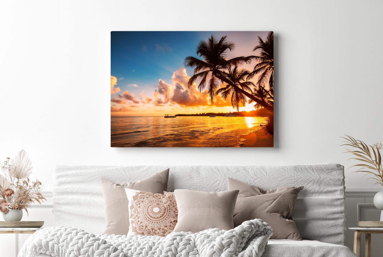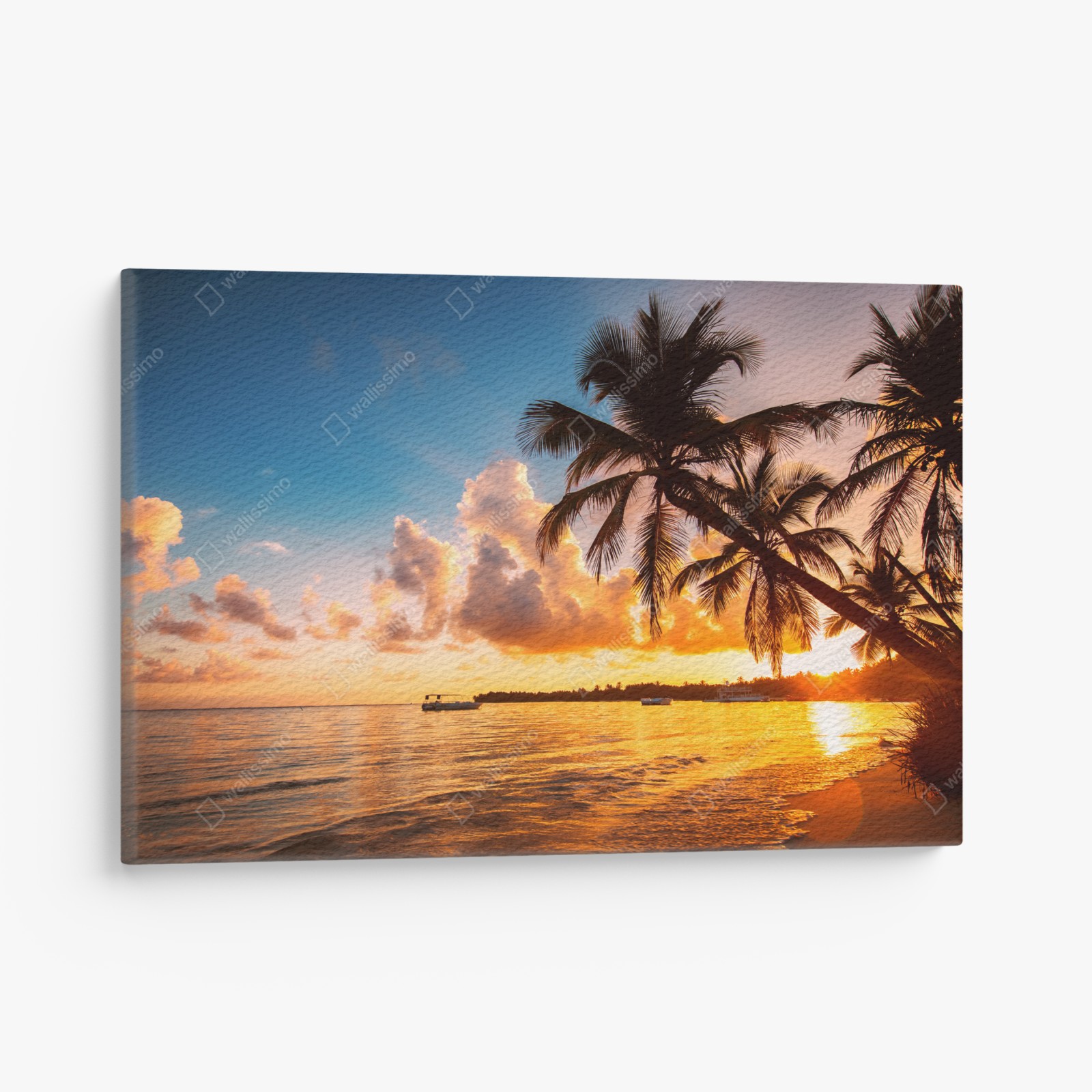 Leinwandbild Tropischer sonnenuntergang mit palmensilhouetten, Dominikanische Republik