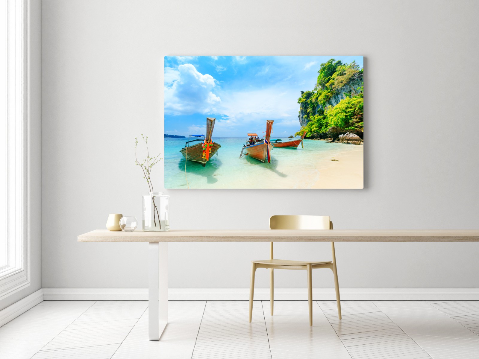 Leinwandbild Longtail-boote am türkisfarbenen strand von Phuket