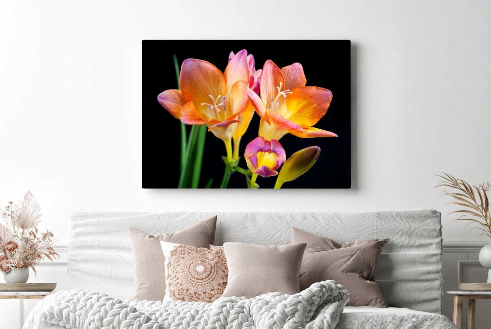 Leinwandbild Leuchtende orange freesien vor schwarzem hintergrund
