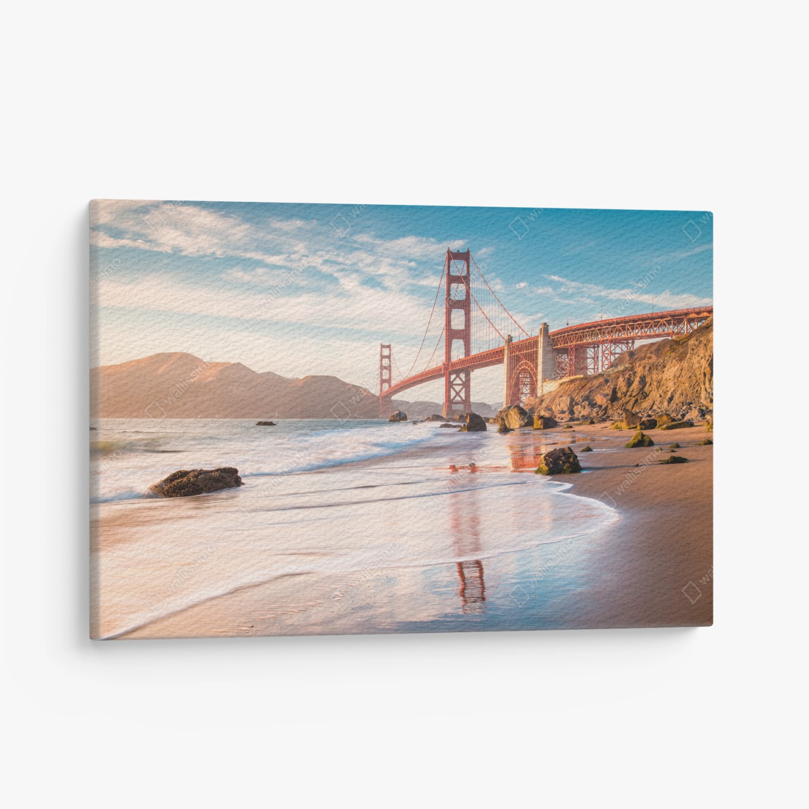 Bringen Sie die ikonische Golden Gate Bridge im warmen Licht der Abenddämmerung in Ihre Räume mit sanften Spiegelungen im Wasser.MehrWeniger