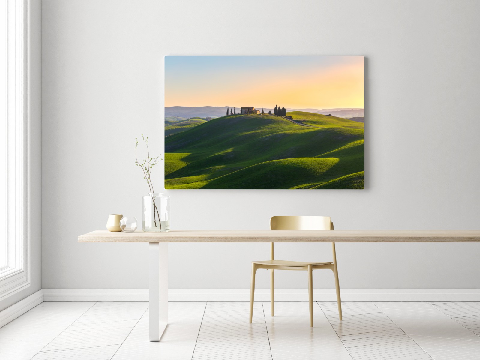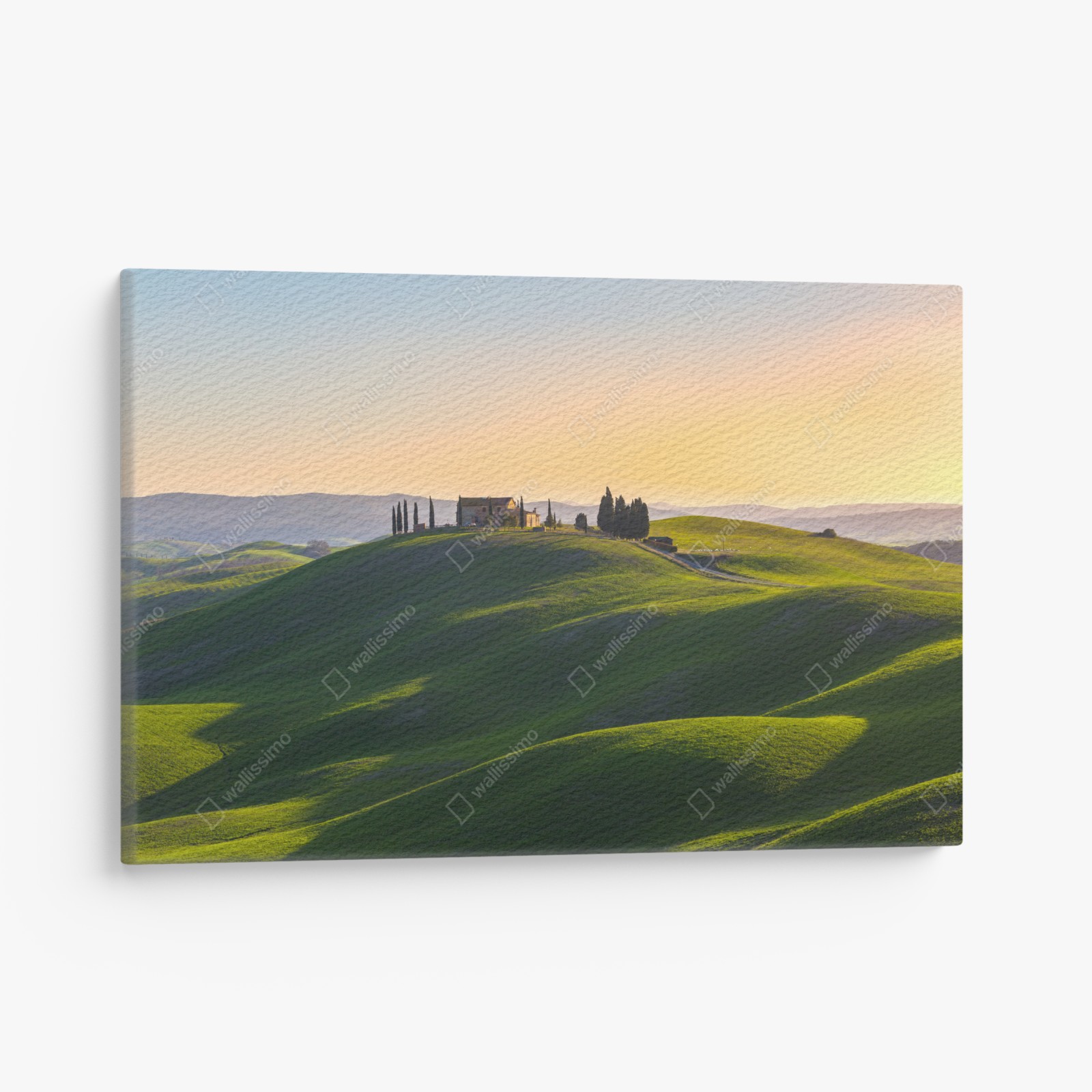 Leinwandbild Bauernhaus auf grünen hügeln, Crete Senesi