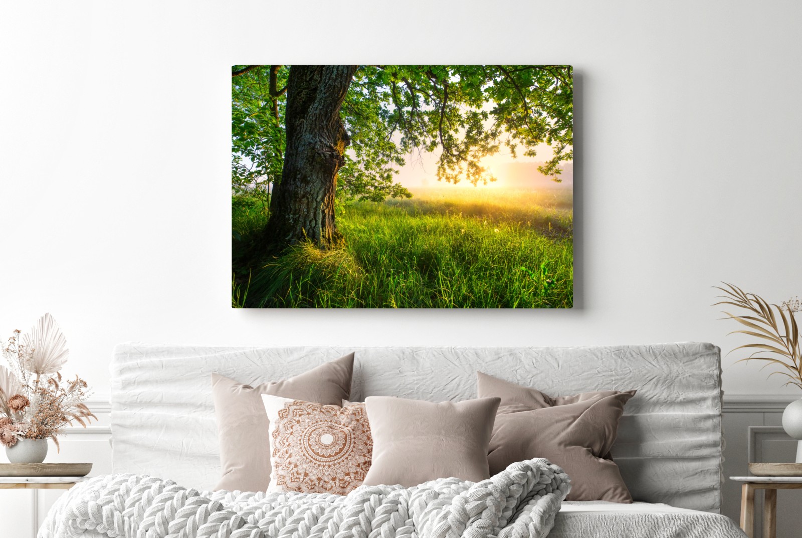 Leinwandbild Morgendliche eiche auf sonnenbeschienener wiese