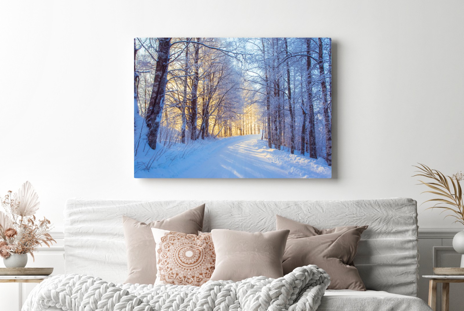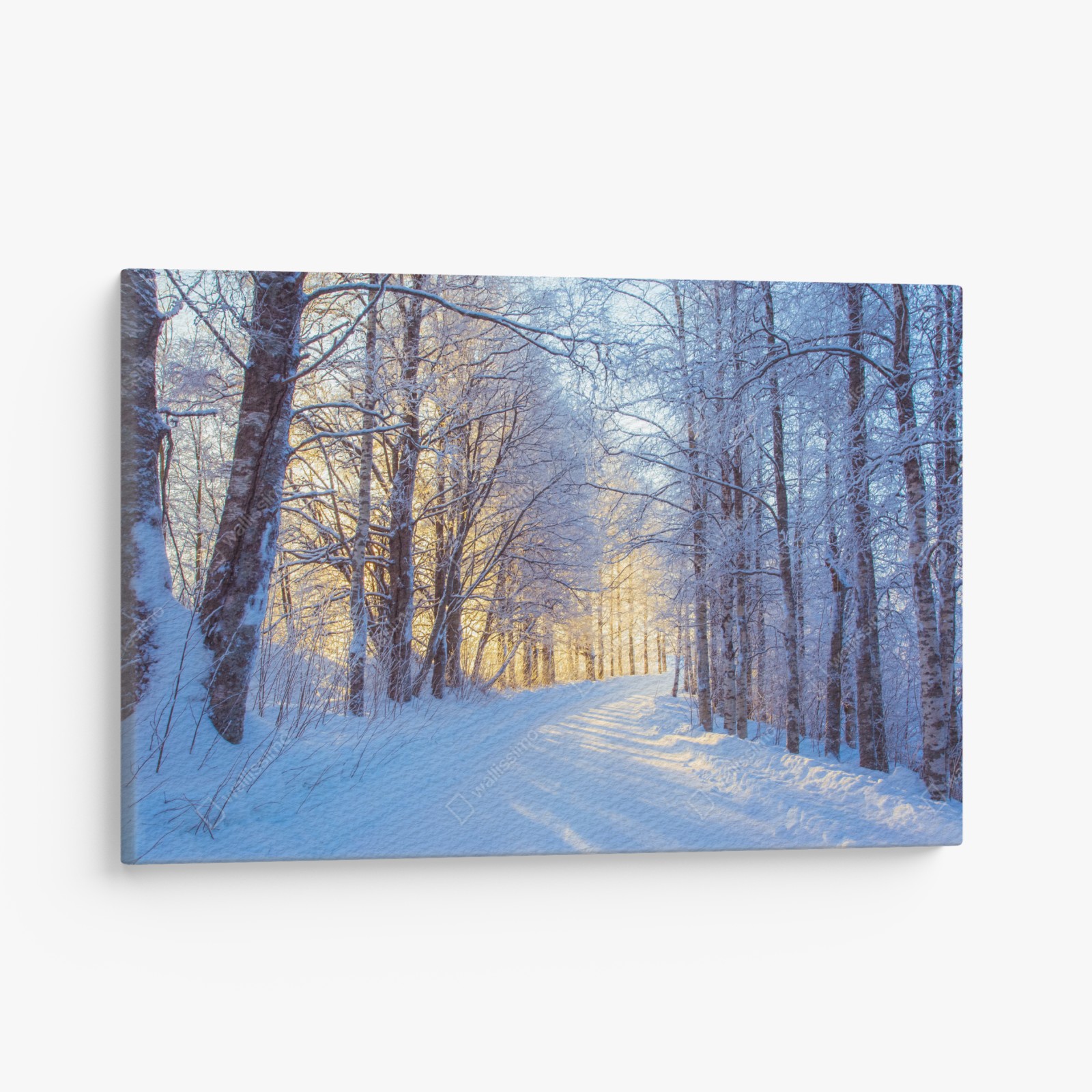 Leinwandbild Birkenwald im winter bei sonnenaufgang