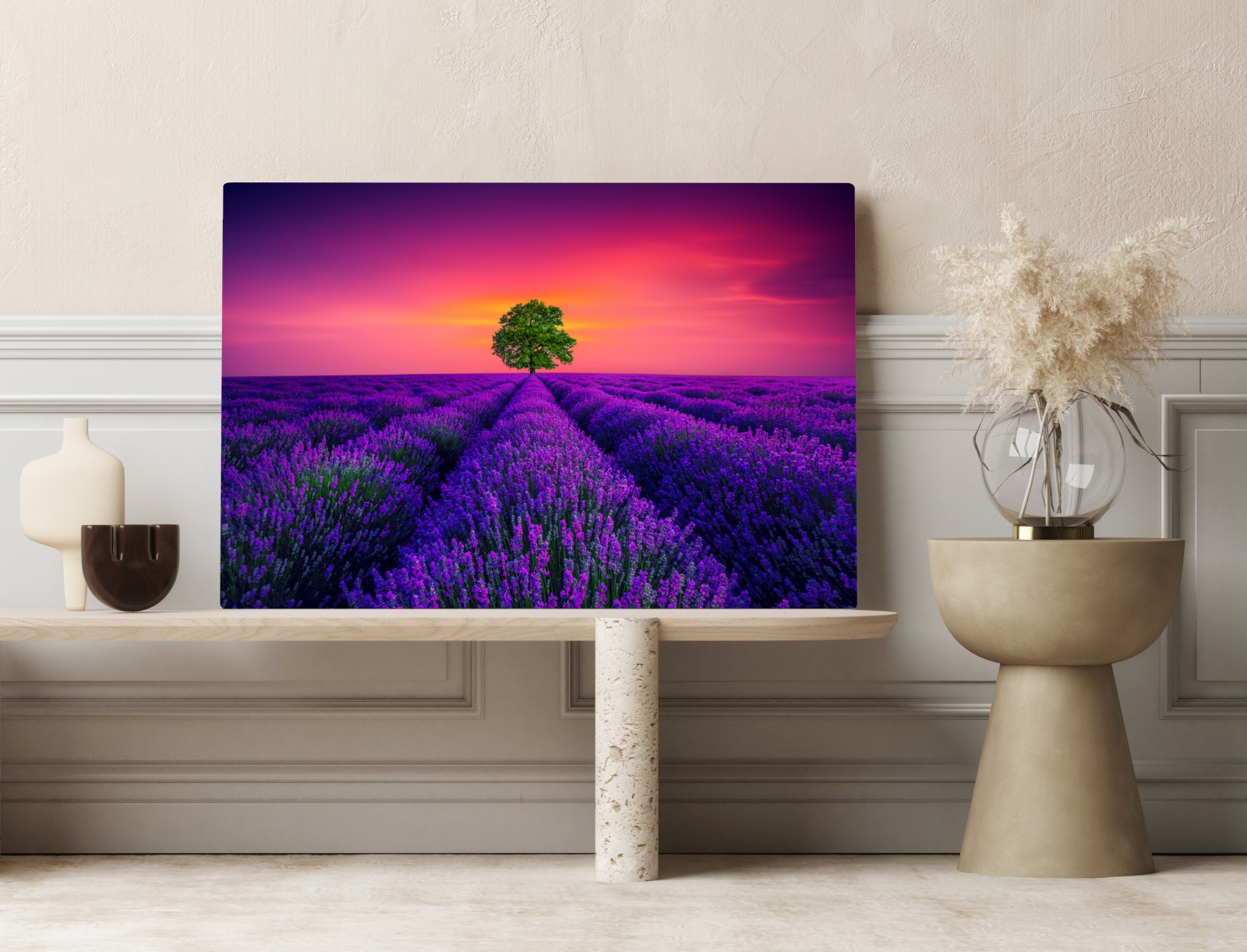 Leinwandbild Lavendelfeld bei sonnenuntergang mit einsamem baum