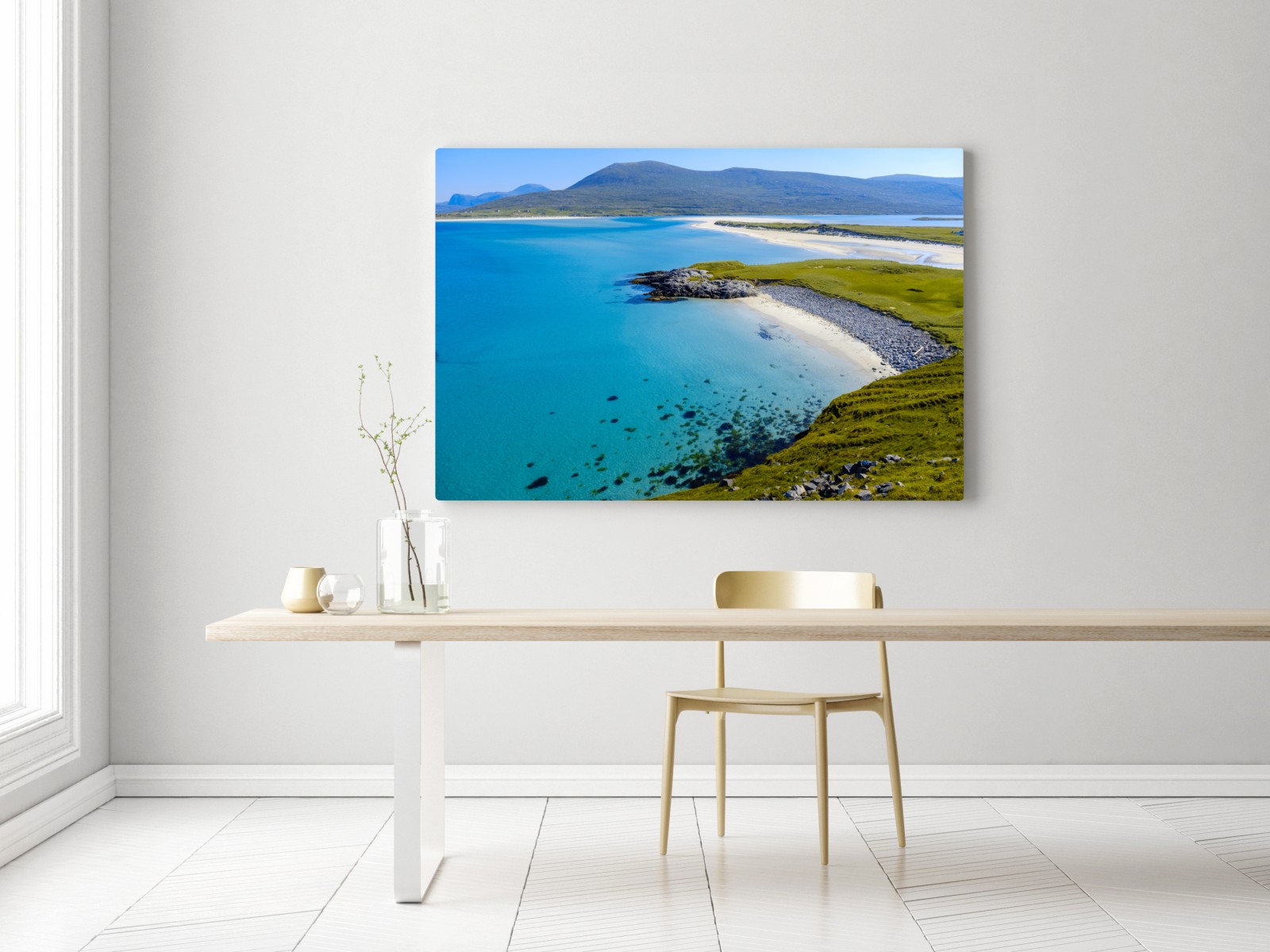 Bringen Sie Küstenruhe in Ihr Zuhause mit dieser lebendigen Luftaufnahme türkisfarbener Gewässer und Dünen, ideal als beruhigender Blickfang.MehrWeniger