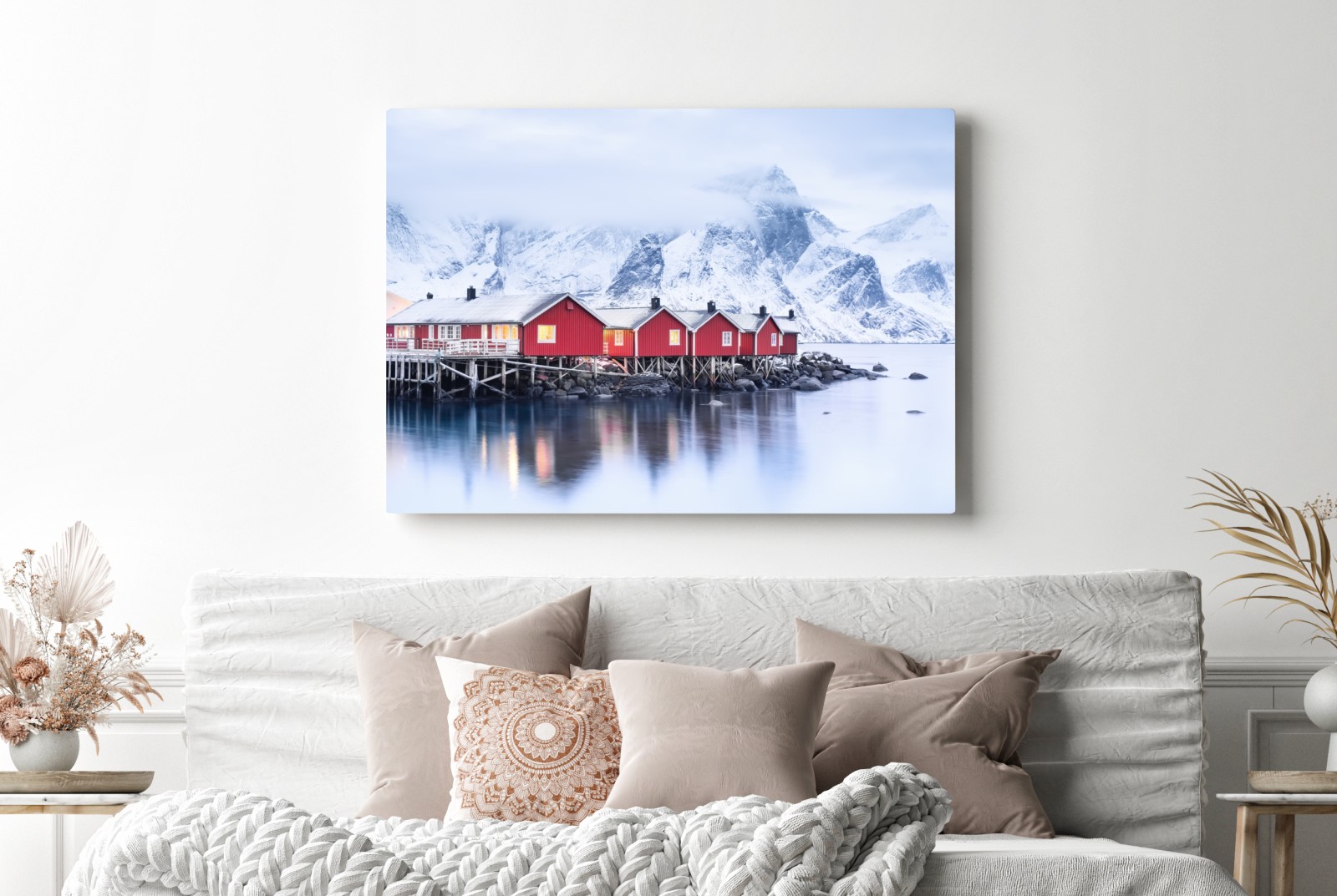 Leinwandbild Sonnenaufgang über den roten hütten der Lofoten