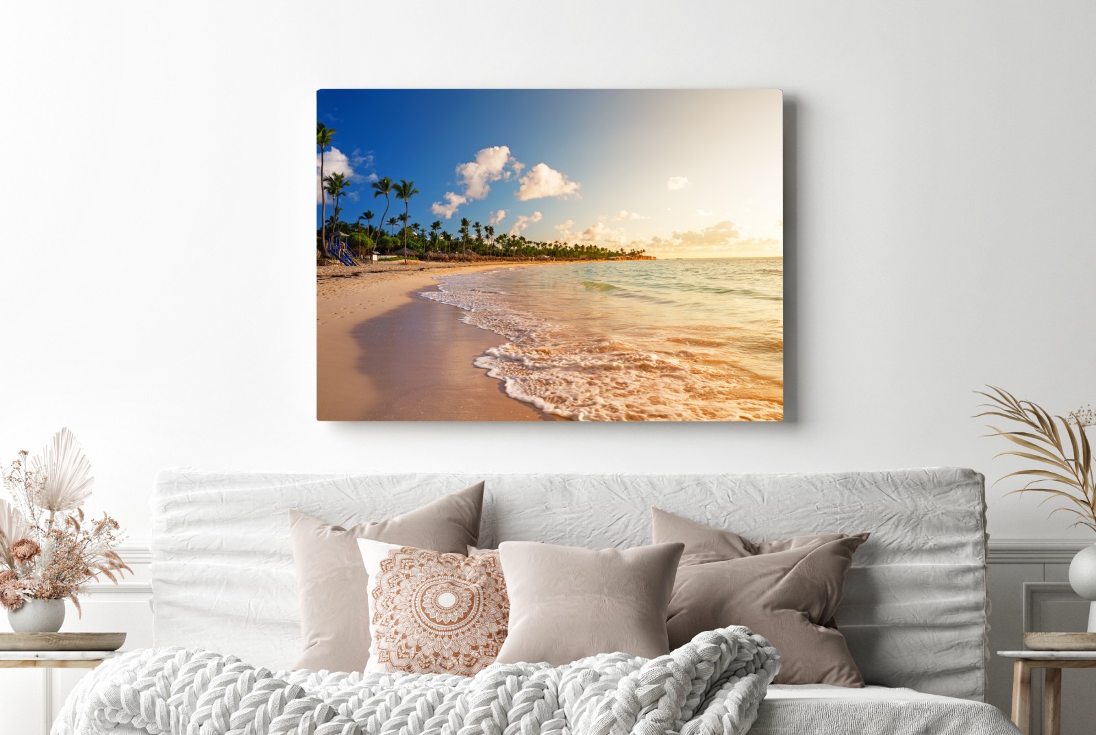 Leinwandbild Tropischer sonnenuntergang am strand mit palmensilhouetten