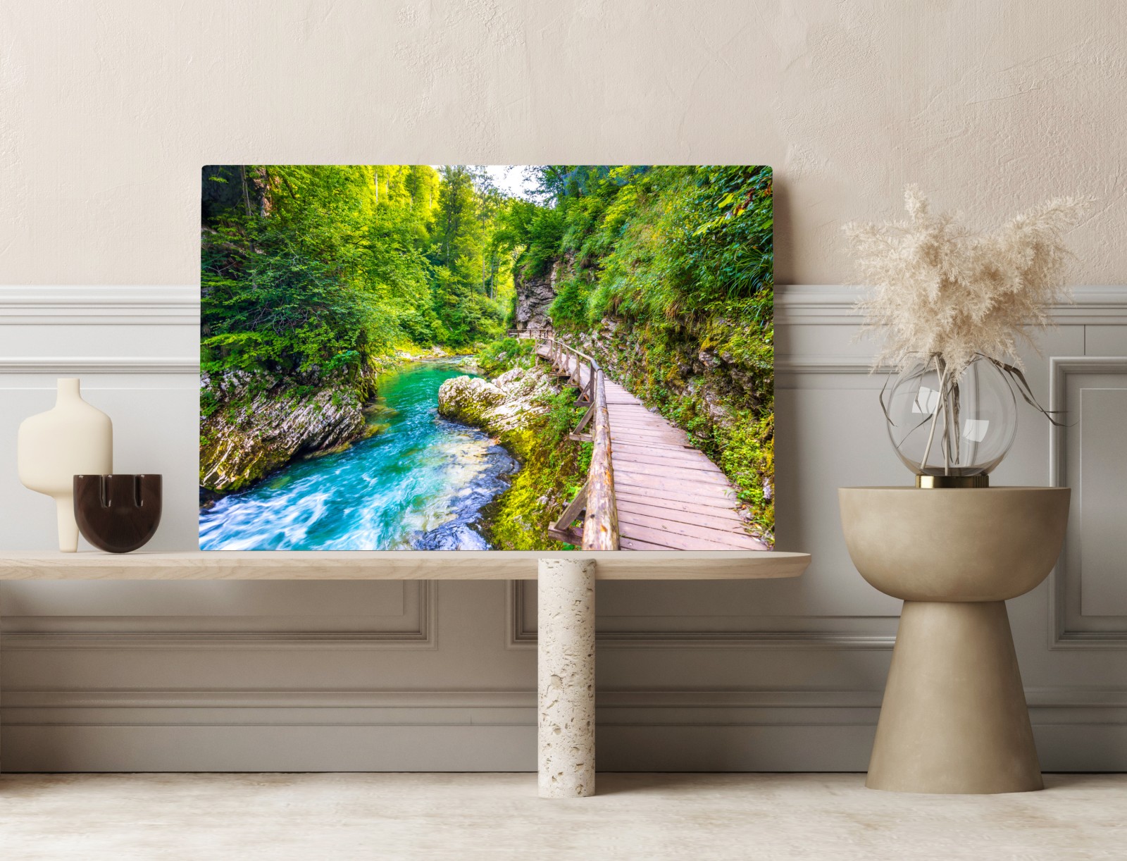 Leinwandbild Türkisfarbener fluss und holzsteg im wald