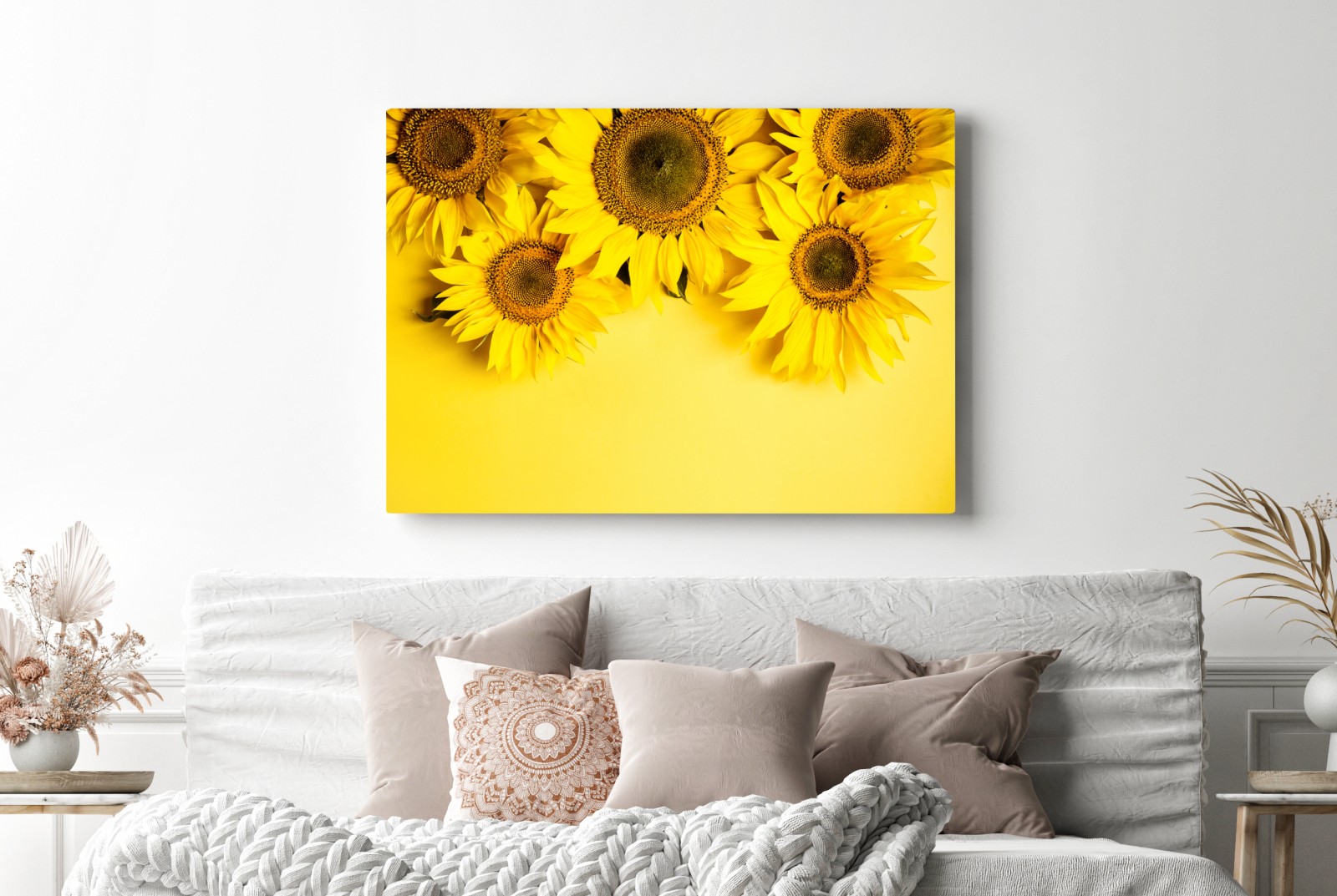 Leinwandbild Leuchtender sonnenblumenstrauß auf gelbem hintergrund