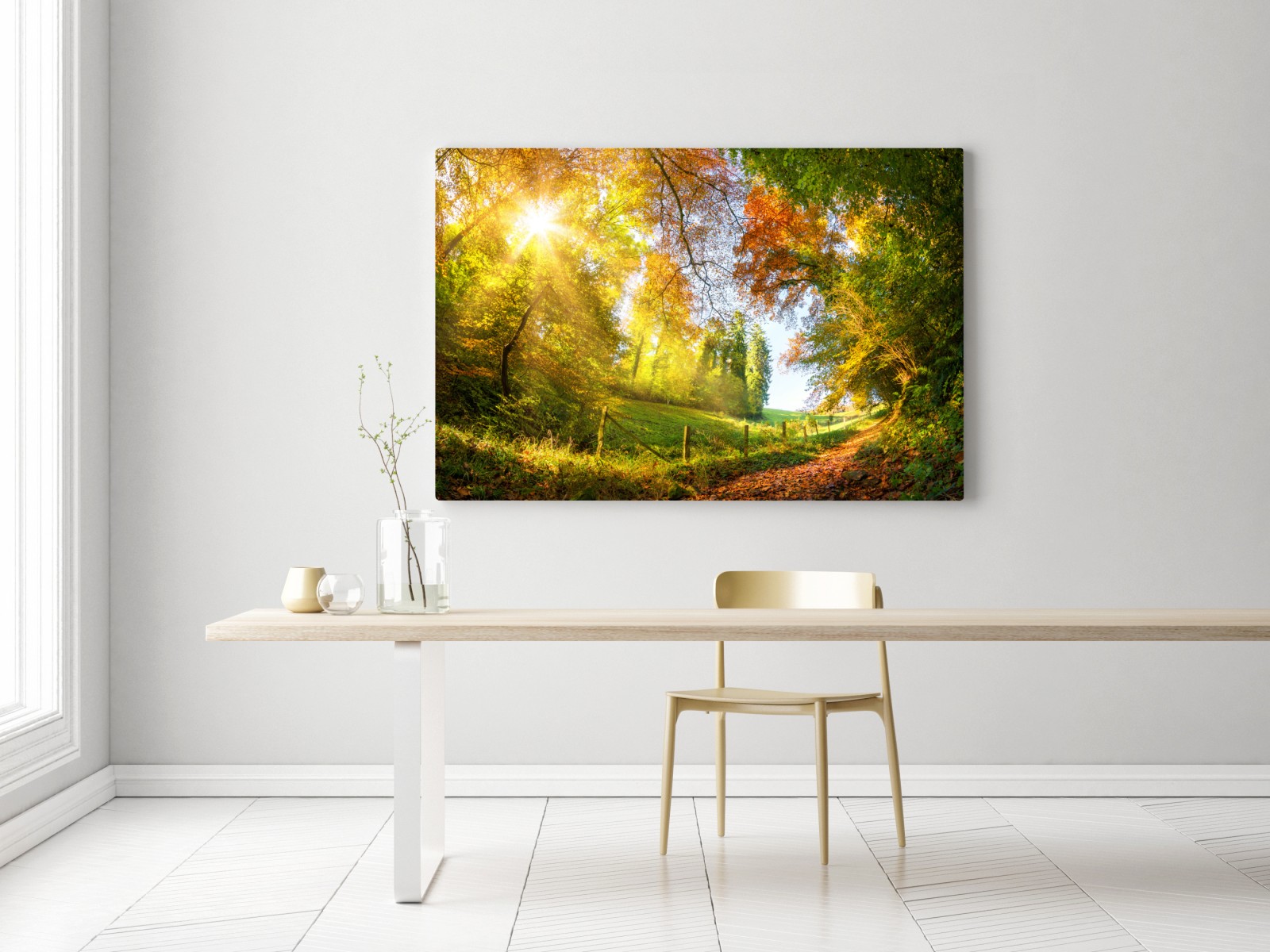 Bringen Sie die Wärme des goldenen Herbstes in Ihr Zuhause mit diesem lebendigen Landschaftsbild, das sonnenbeschienene Wiesen und einen gewundenen Waldweg zeigt.MehrWeniger