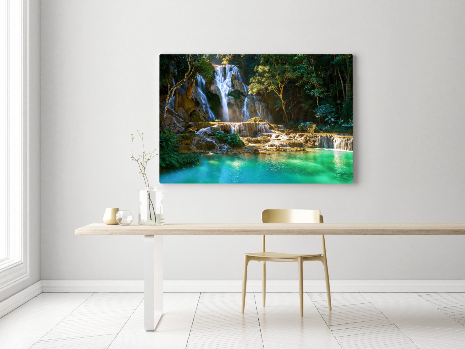 Leinwandbild Türkisfarbener wasserfall im üppigen wald