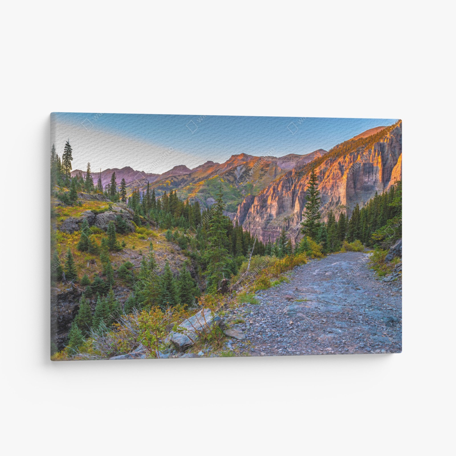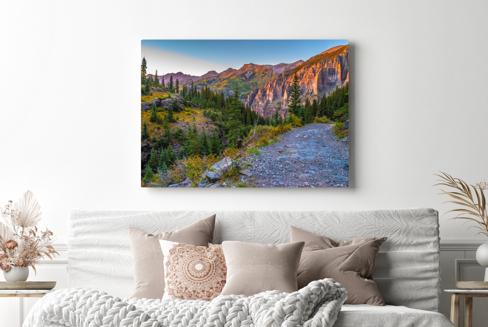 Leinwandbild Alpiner wanderweg im sonnenuntergang