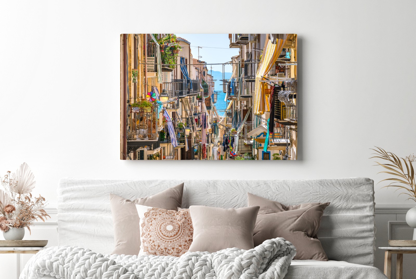 Bringen Sie das warme Flair einer sonnenbeschienenen Mittelmeergasse in Ihr Zuhause mit diesem lebendigen Küstenmotiv, ideal zur Aufwertung von Wohnzimmer oder Flur.MehrWeniger