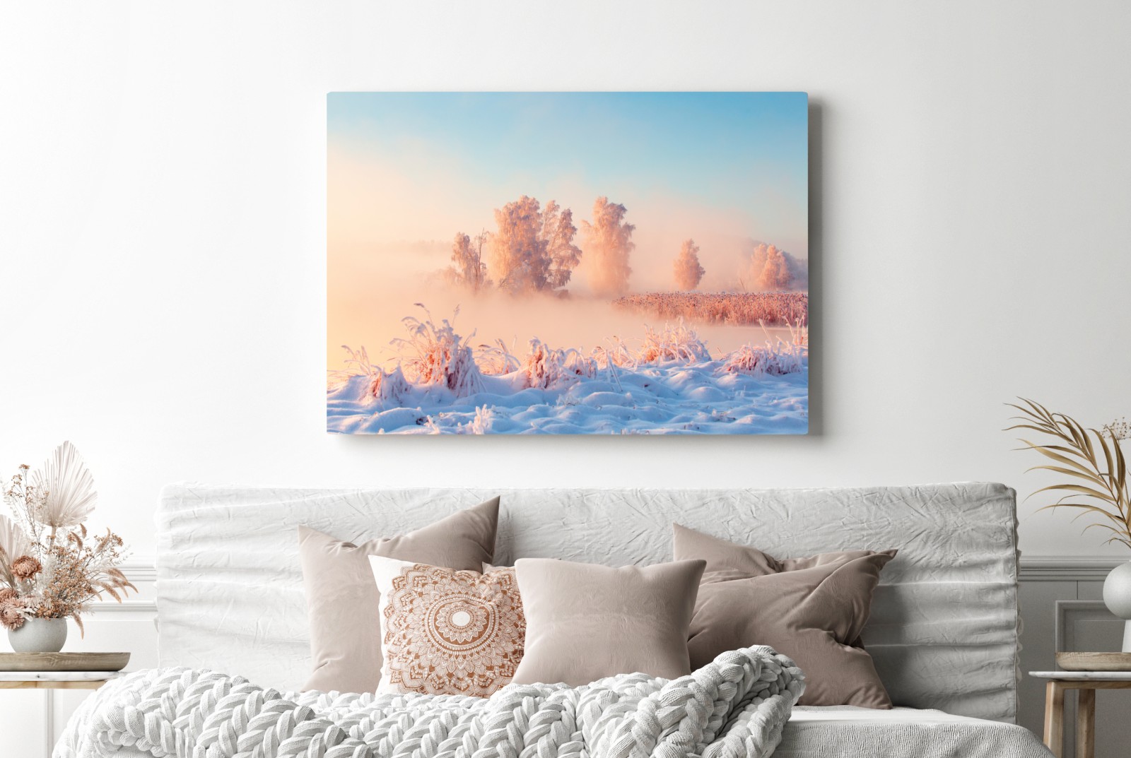 Leinwandbild Winterlicher sonnenaufgang über einer frostigen wiese