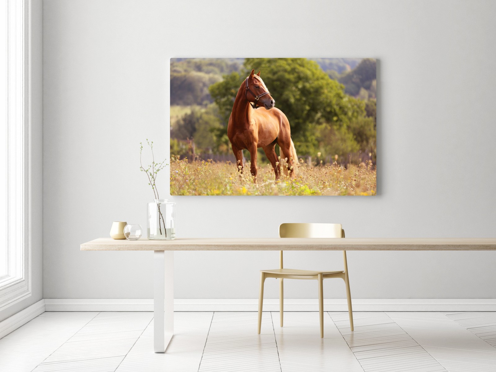 Leinwandbild Majestätisches kastanienbraunes pferd auf sommerlicher wiese