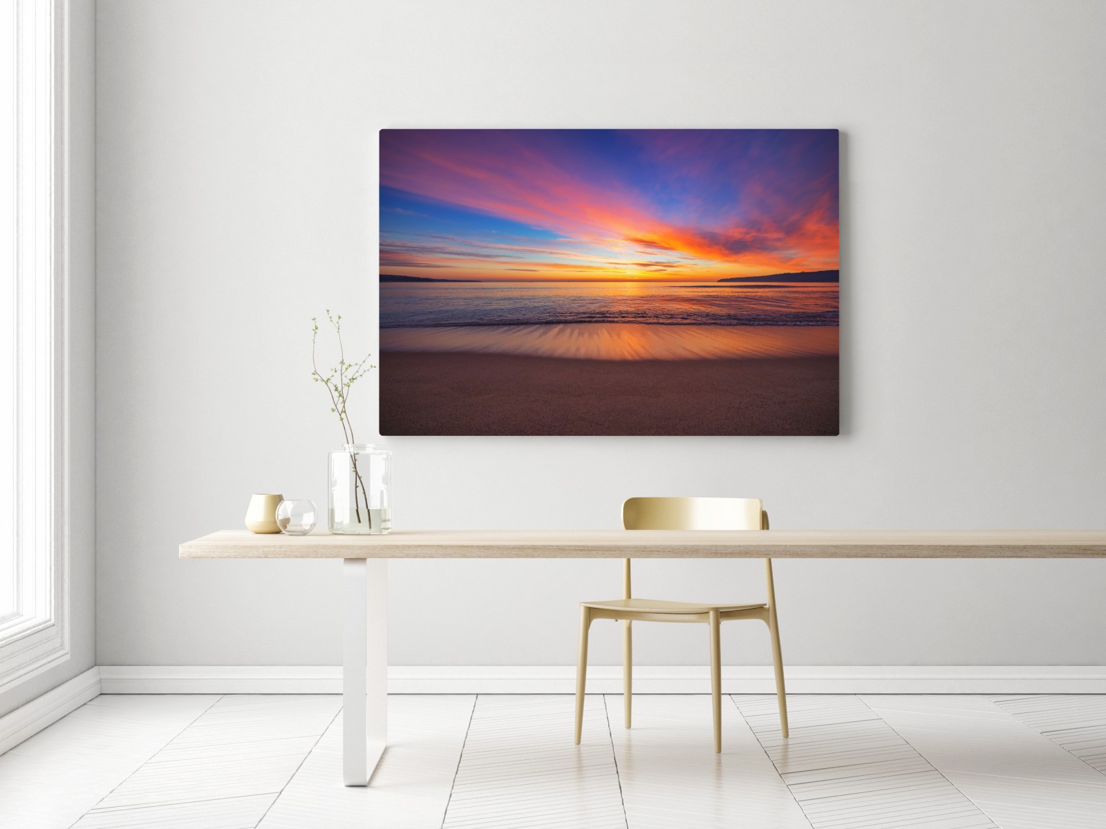 Leinwandbild Lebendiger sonnenaufgang über einem ruhigen strand