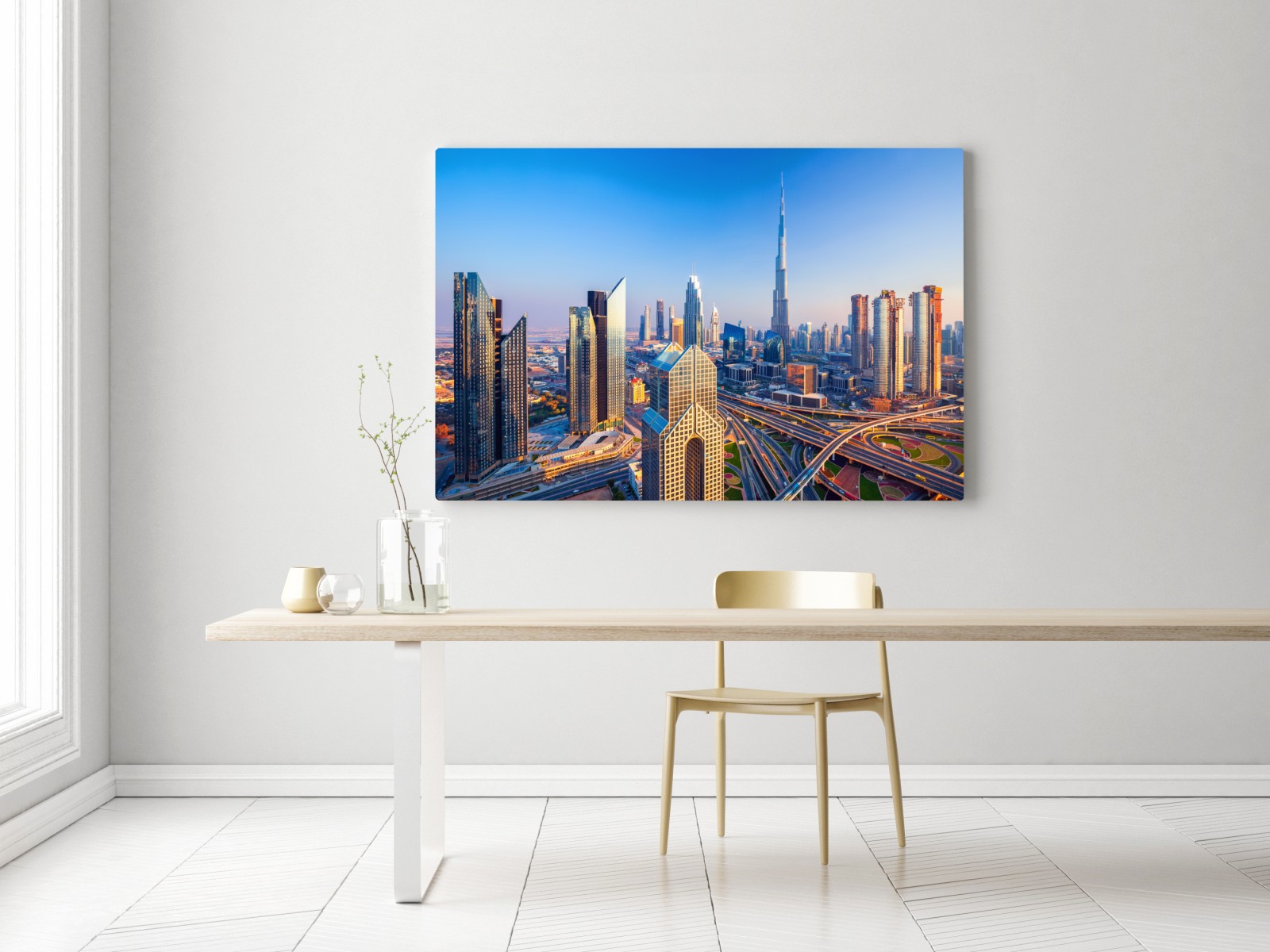 Leinwandbild Panorama Dubais mit Burj Khalifa bei sonnenuntergang