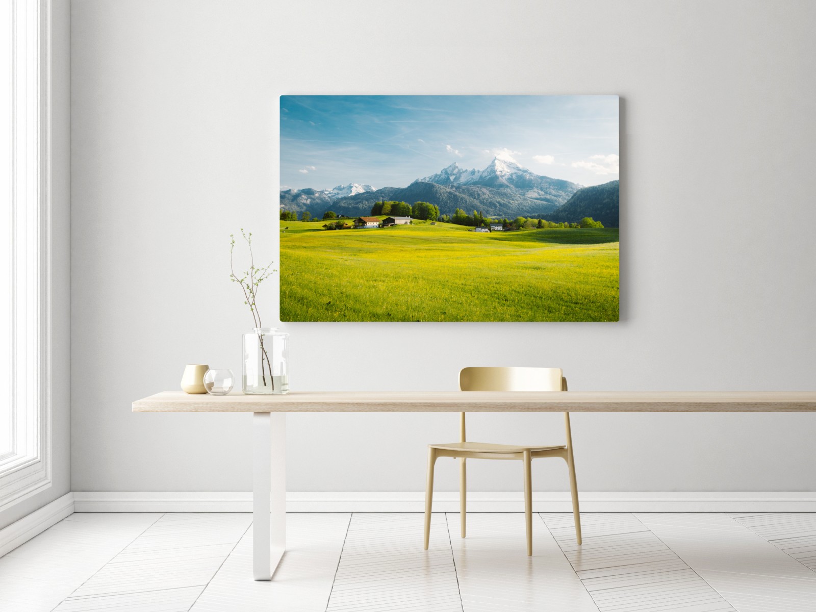Leinwandbild Alpwiese unter schneebedeckten gipfeln