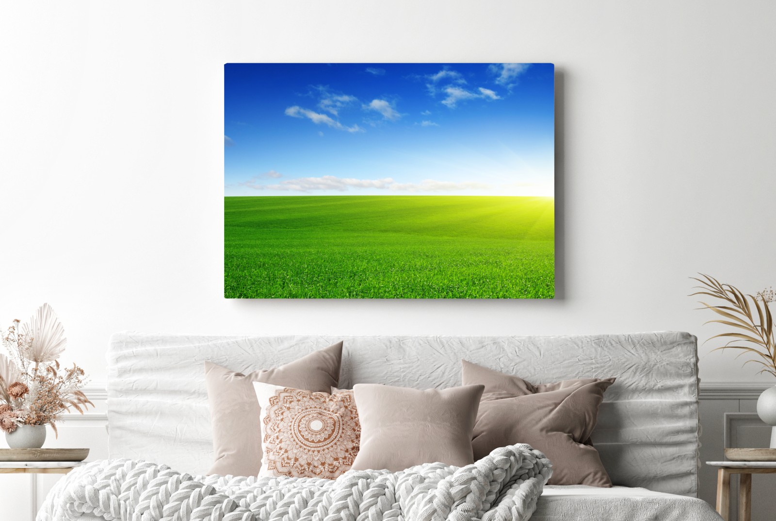 Leinwandbild Sonnenbeschienene grüne wiese im morgenlicht