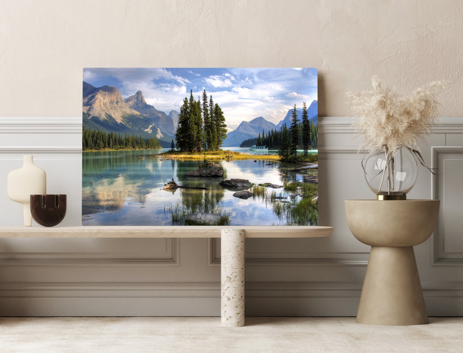 Leinwandbild Ruhiger alpensee mit insel und bergen