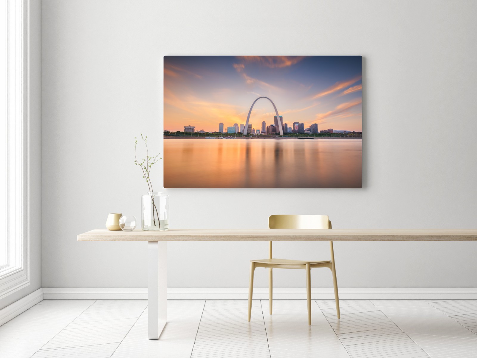 Erleben Sie die warme Stimmung von St. Louis bei Dämmerung mit diesem urbanen Stadtbild, das Gold- und Rosatöne über dem Mississippi einfängt.MehrWeniger