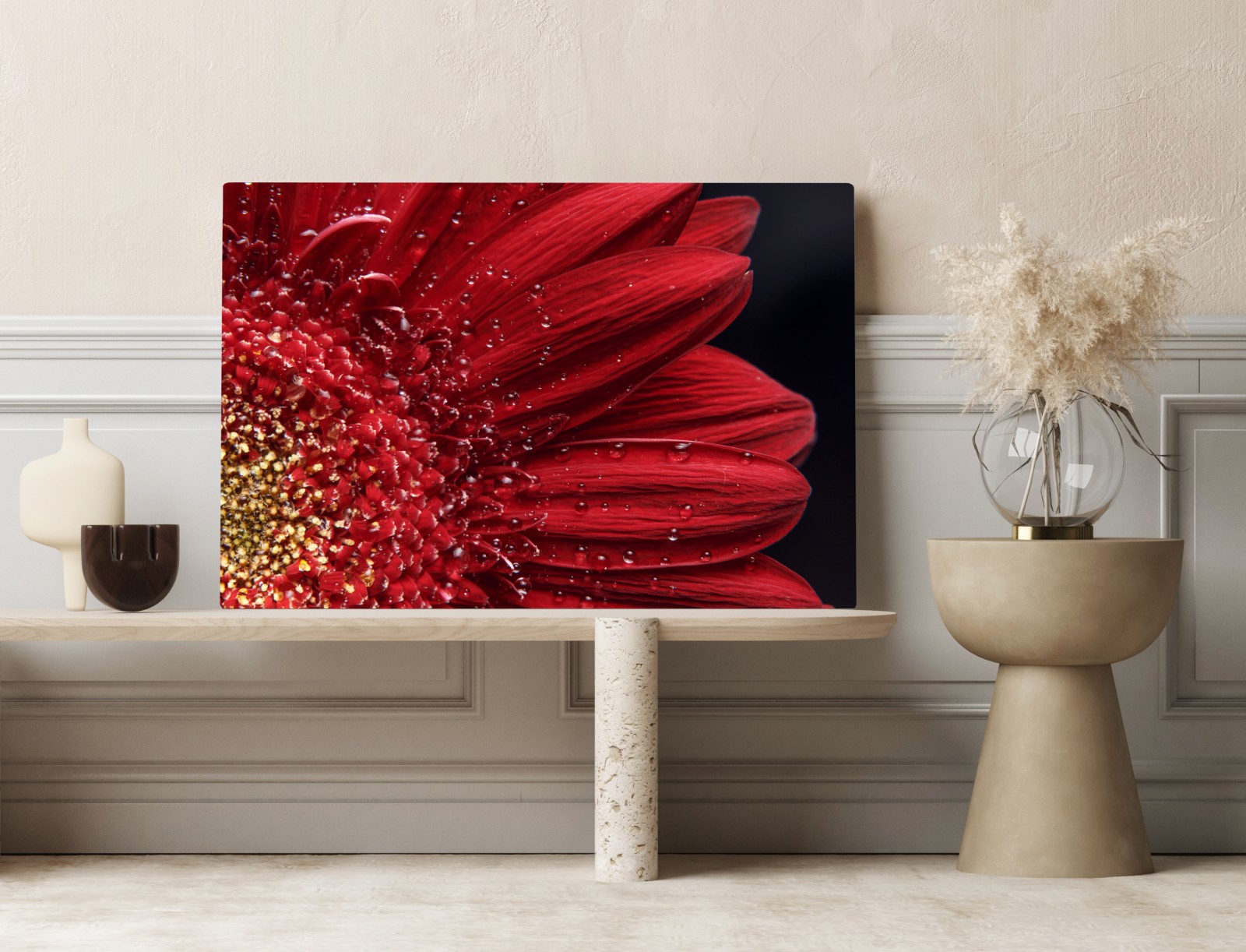 Leinwandbild Rote gerbera makro mit wassertropfen