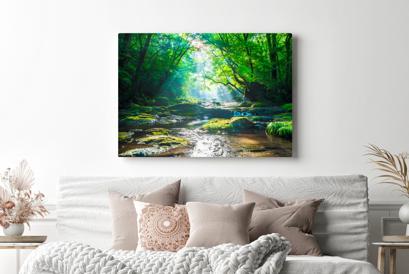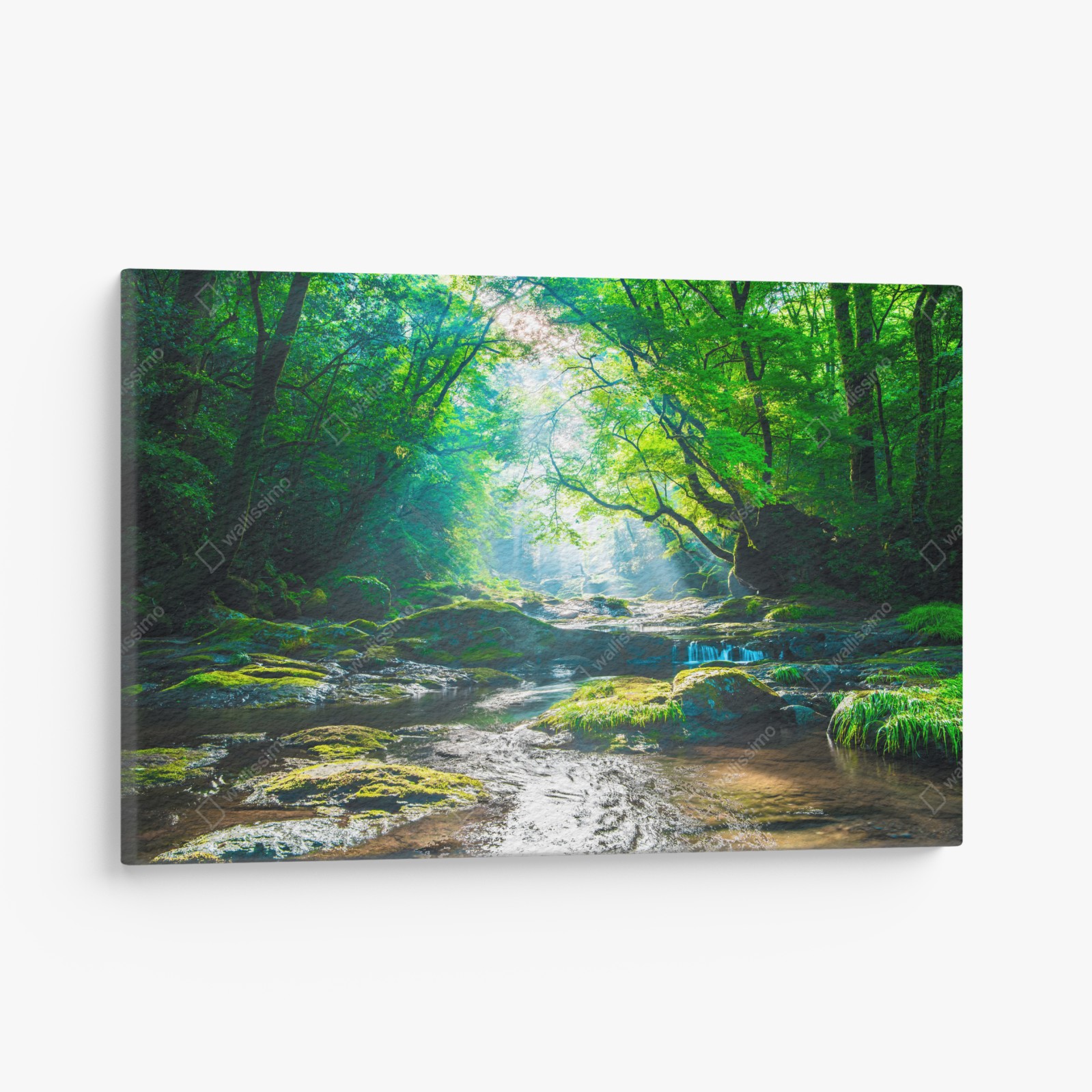 Leinwandbild Sonnendurchfluteter waldbach mit moosbedeckten steinen