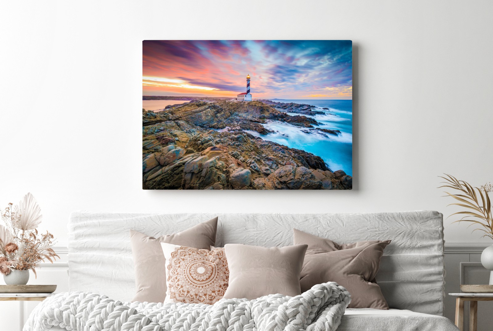 Leinwandbild Sonnenuntergang bei leuchtturm Favaritx, Menorca