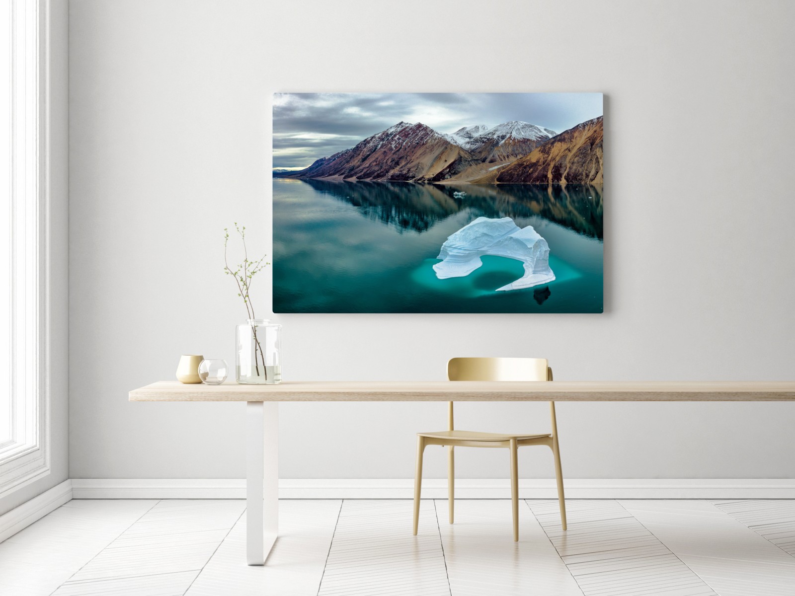 Leinwandbild Eisberg und bergreflexionen in türkisfarbenem wasser