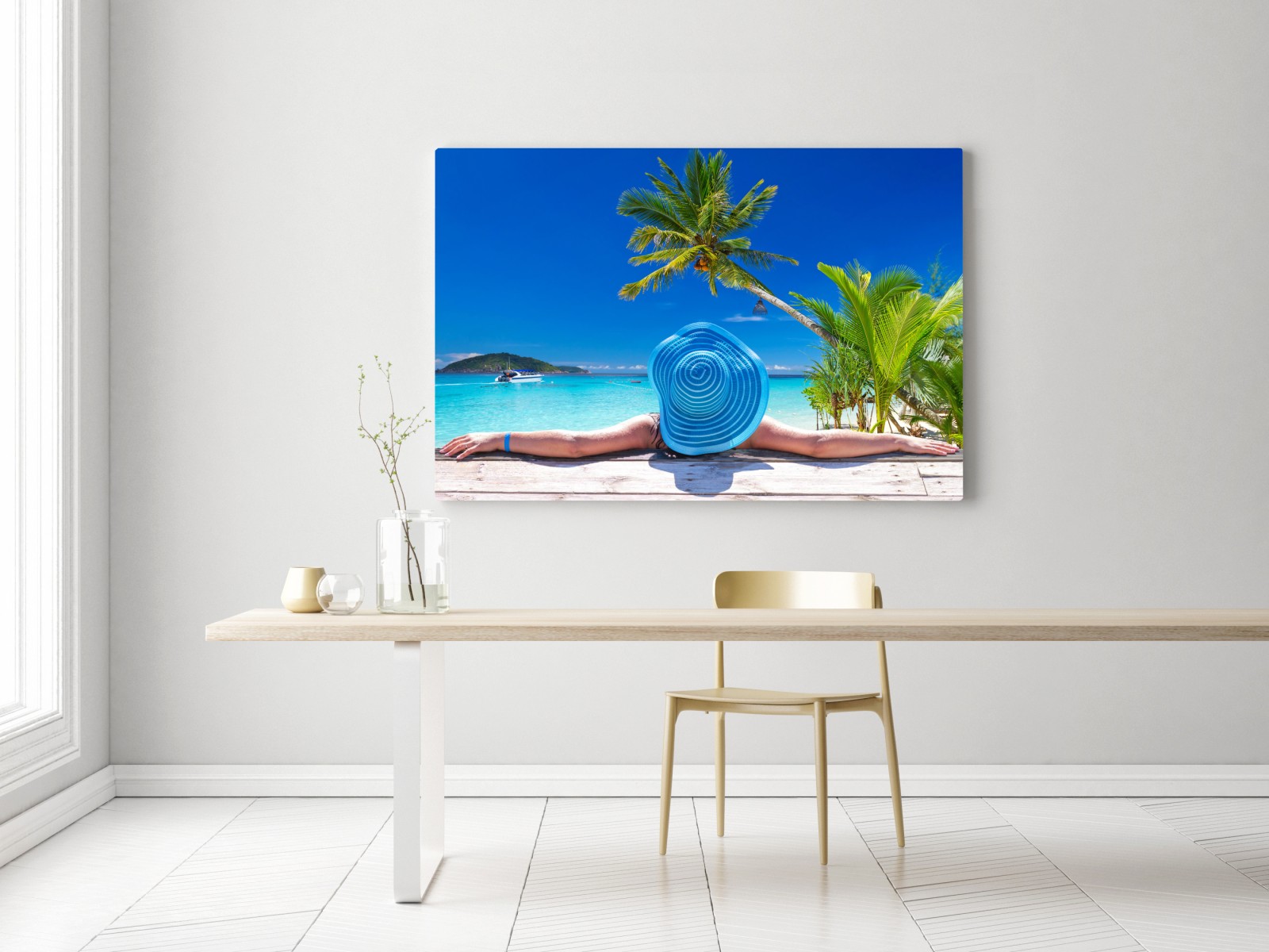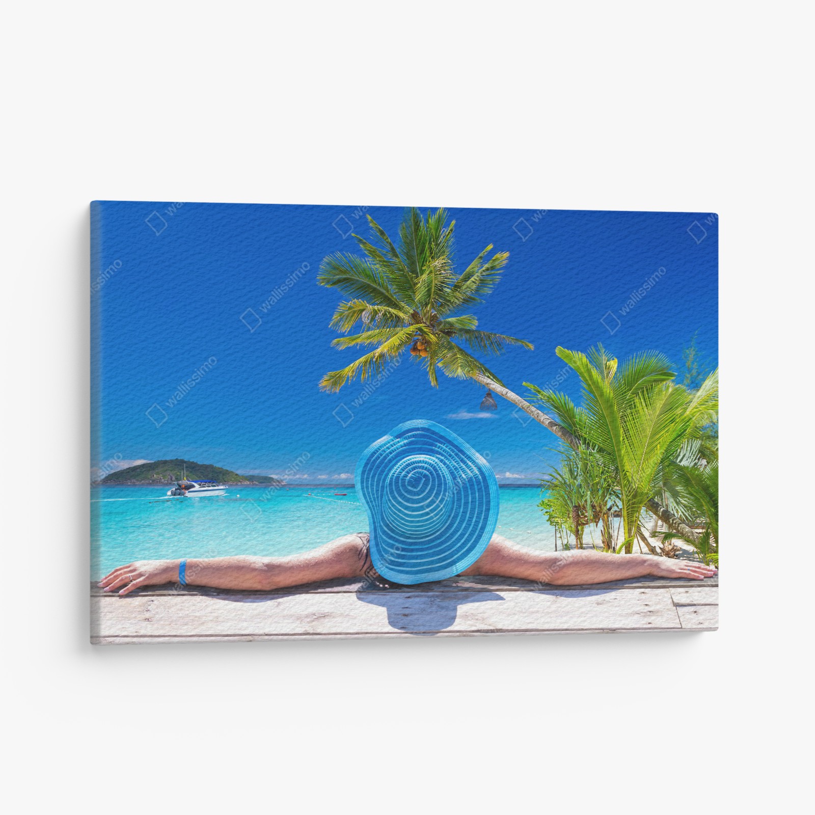 Leinwandbild Tropischer strand mit blauem sonnenhut